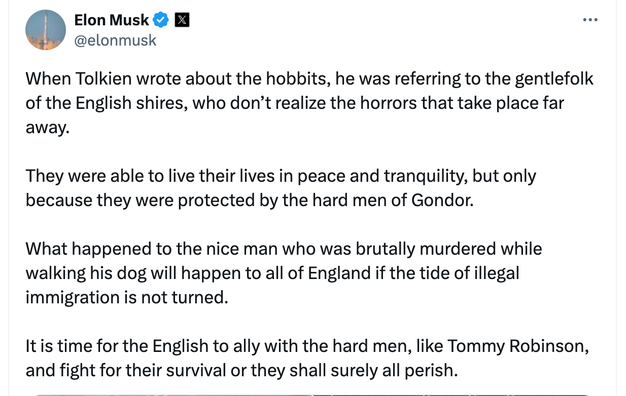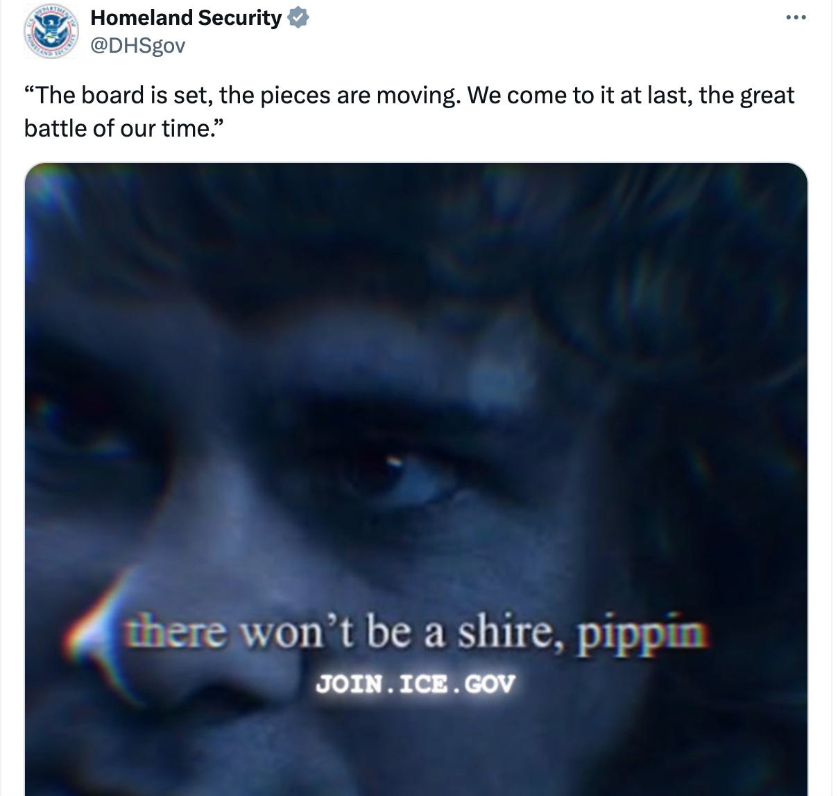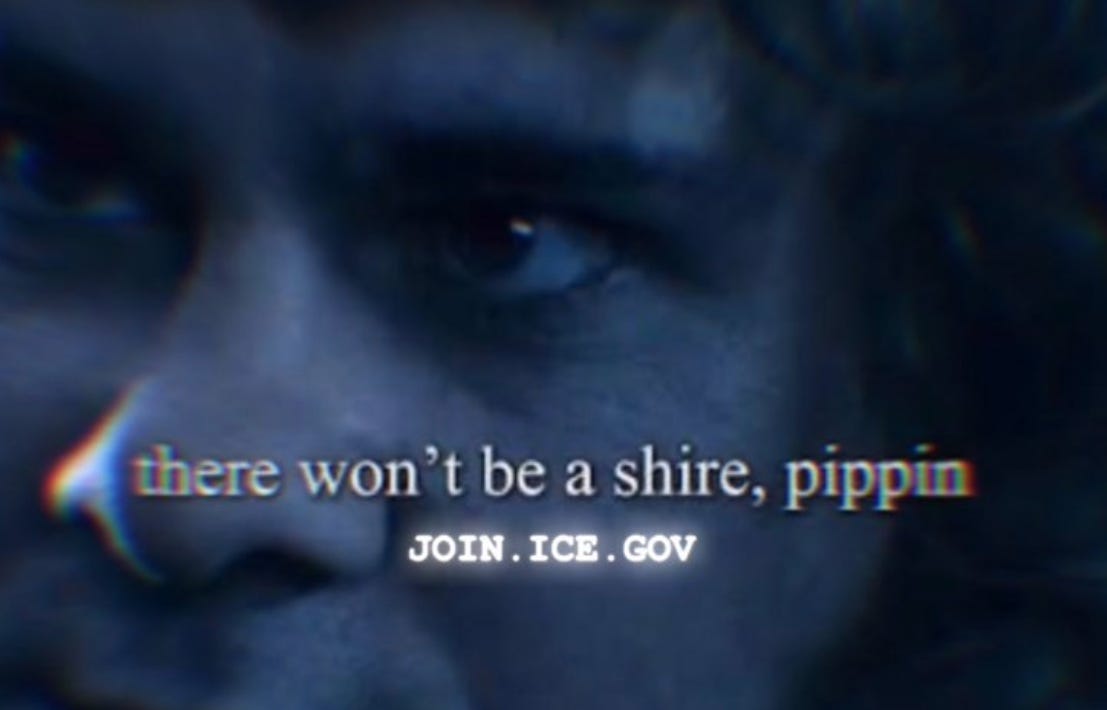 Similarly, when the U.S. government goes on X and uses Tolkien language to insist that “There won’t be a shire, Pippin”—unless people start enlisting in ICE, I think that’s fairly coercive, and really not what the original author intended. WIRED recently wrote on this, and the Tolkien appropriation phenomenon, citing Emma Vossen, a Tolkien scholar and assistant professor of Game Studies at Brock University in Ontario, Canada. Vossen claims that, “Attaching yourself to Tolkien is part of a larger psychological phenomenon... Those who wish to oppress need to see themselves as underdogs (i.e., Hobbits) to justify their actions and values to themselves. It’s very similar to the way the far right uses and abuses the bible to justify their actions.”