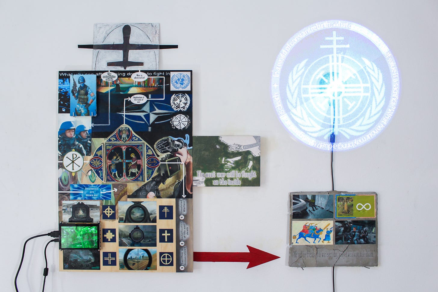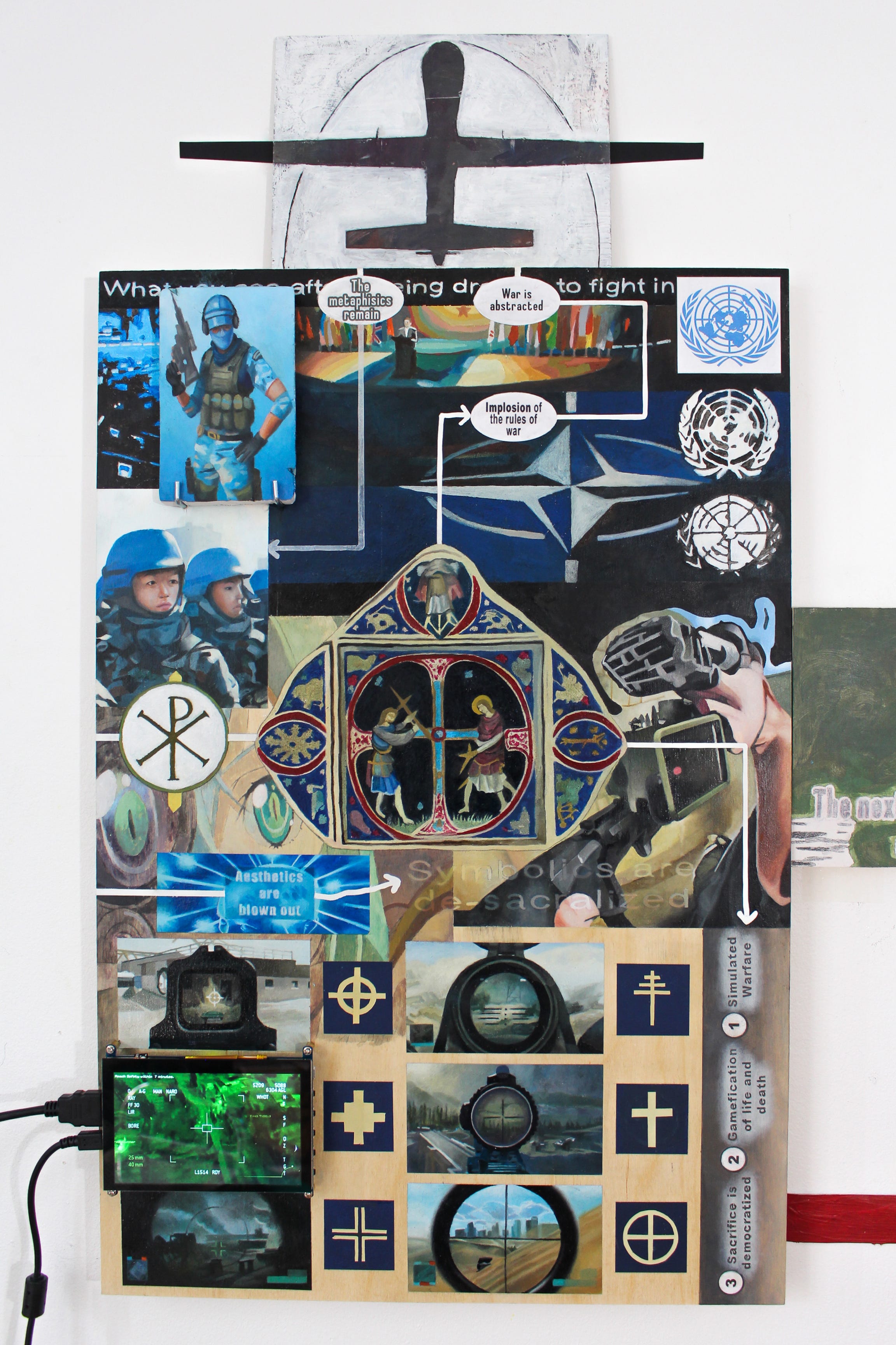 This painting is a study of the symbolisms associated with video game warfare, religion and international politics. I have found that new spiritualities and myths emerge from daily practices of playing through the Call of Duty or Battlefield franchises. I have developed some sensibilities toward the symbols and rituals that coexist with the running and gunning of these FPS. I also believe that war games and international politics are naturally interconnected through their symbolisms, every so often we can witness these two fields seeping into one another.