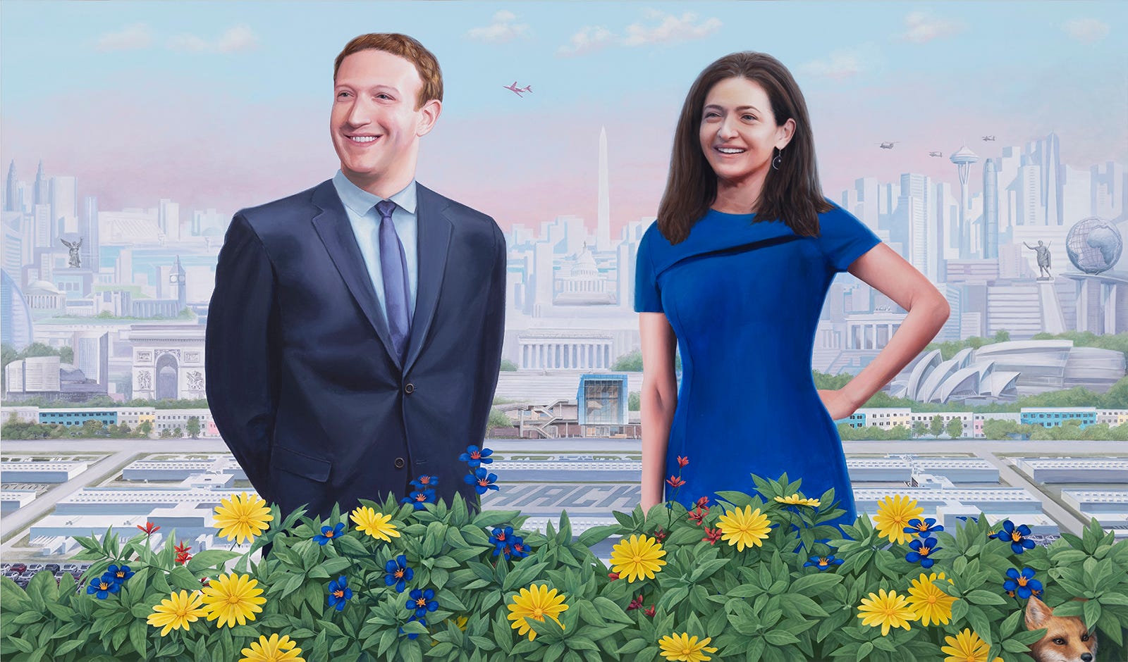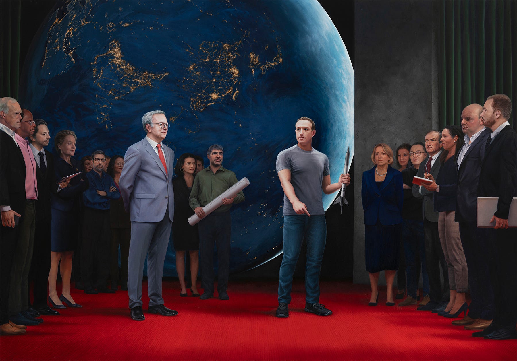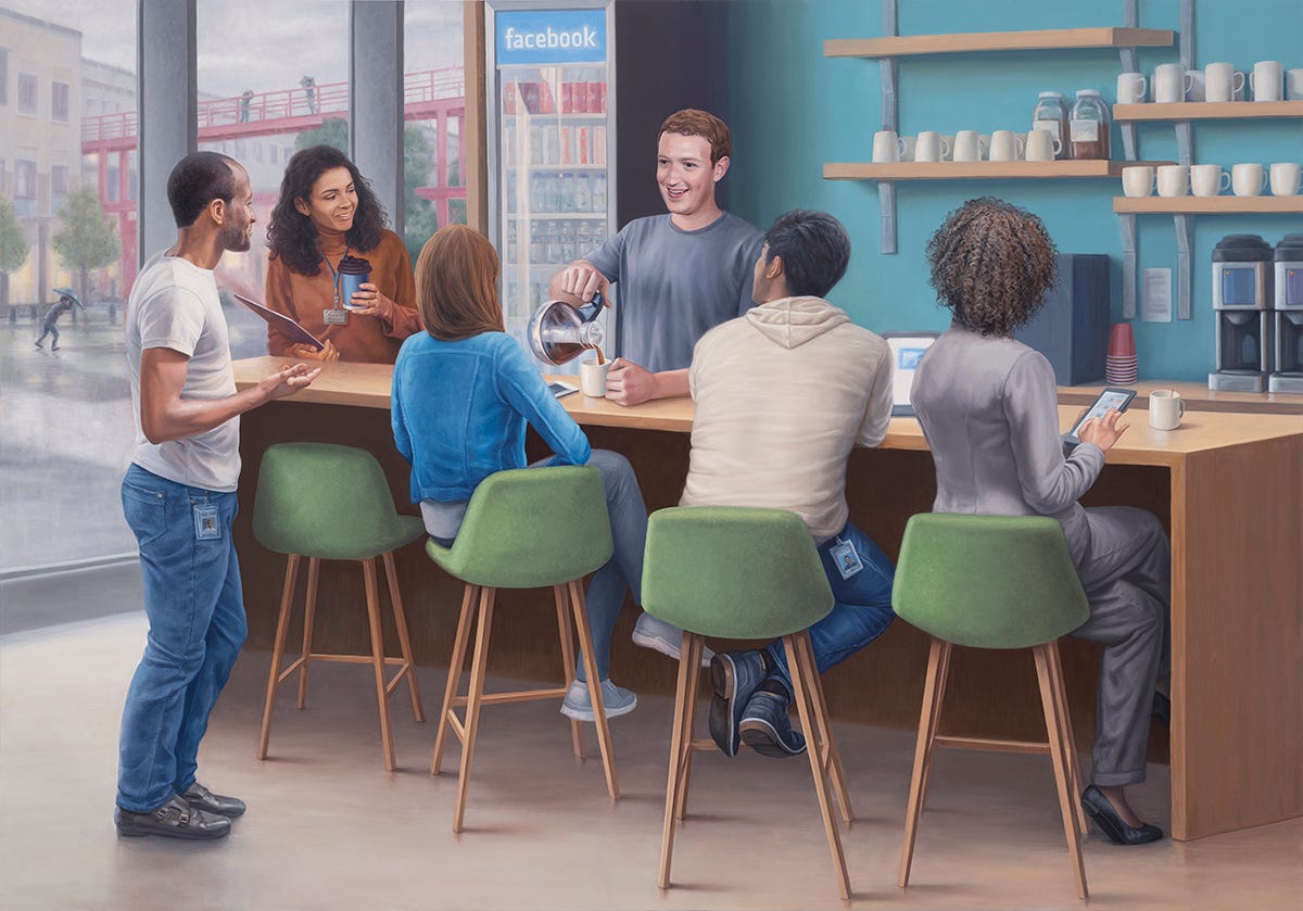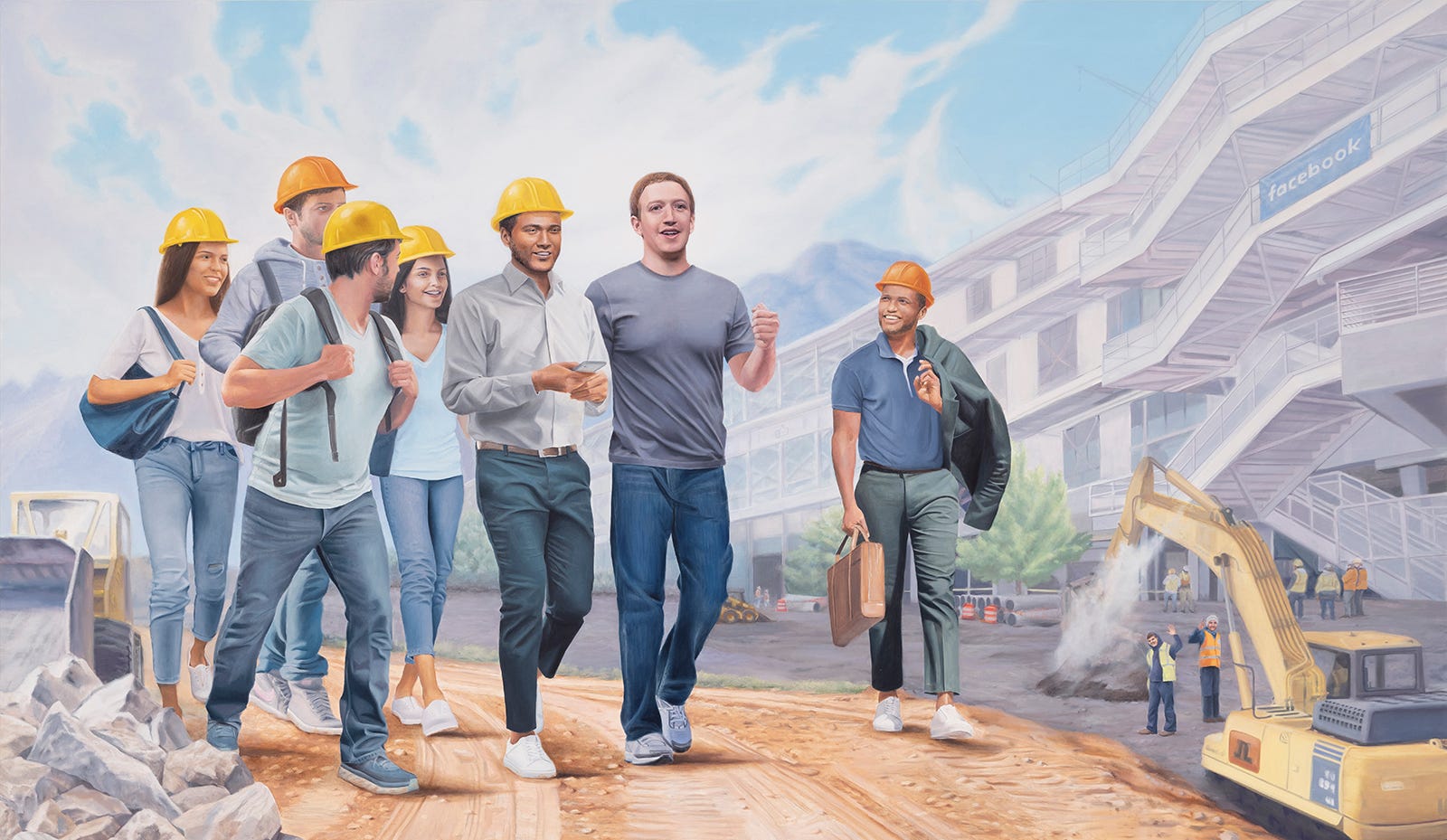 I found a parallel contrast between Mark Zuckerberg’s naively nerdy robotic enthusiasm and his unbreachable control of one of the world’s most powerful companies. To portray him as the “Beloved Leader”, I borrowed several aggrandizing formal gestures from the source material: the legendary leader, often noticeably taller than his comrades despite his actual height, is flanked by attractive, propaganda-friendly archetypes who look to him for inspiration and guidance. The characters seem more like heroic statues than actual human beings. And the compositions all focus on glorifying the Leader.