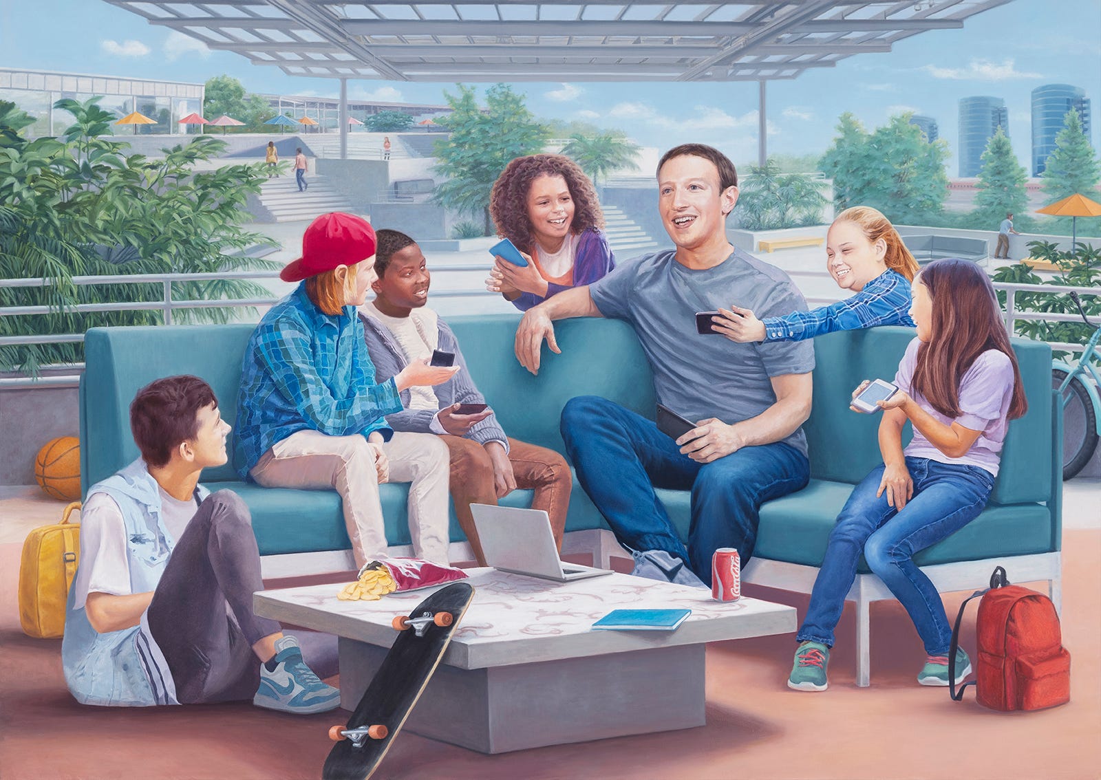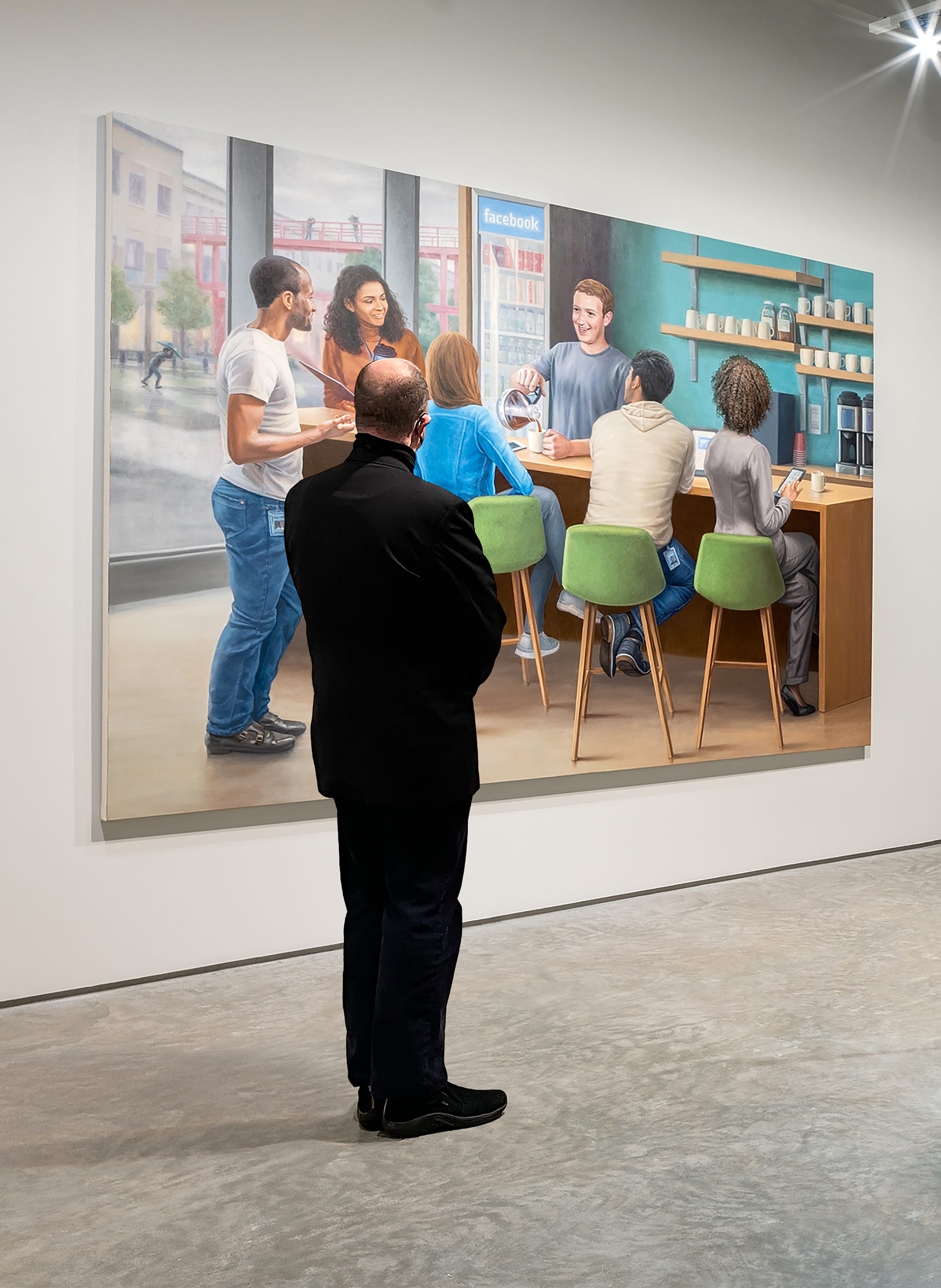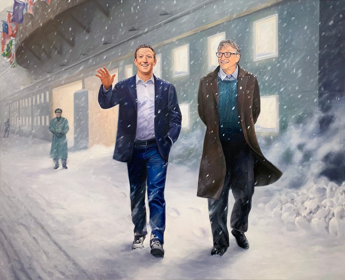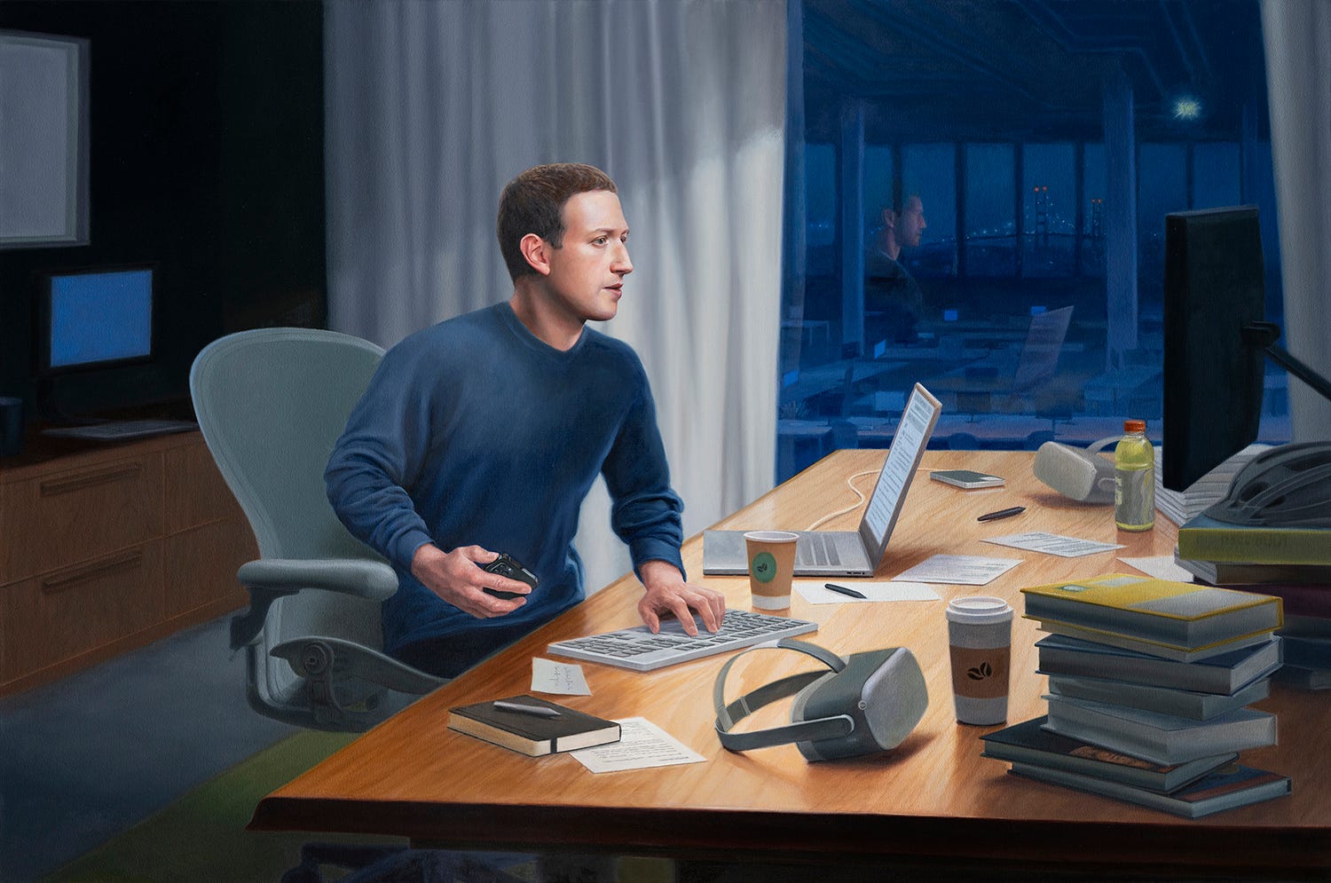 I found a parallel contrast between Mark Zuckerberg’s naively nerdy robotic enthusiasm and his unbreachable control of one of the world’s most powerful companies. To portray him as the “Beloved Leader”, I borrowed several aggrandizing formal gestures from the source material: the legendary leader, often noticeably taller than his comrades despite his actual height, is flanked by attractive, propaganda-friendly archetypes who look to him for inspiration and guidance. The characters seem more like heroic statues than actual human beings. And the compositions all focus on glorifying the Leader.