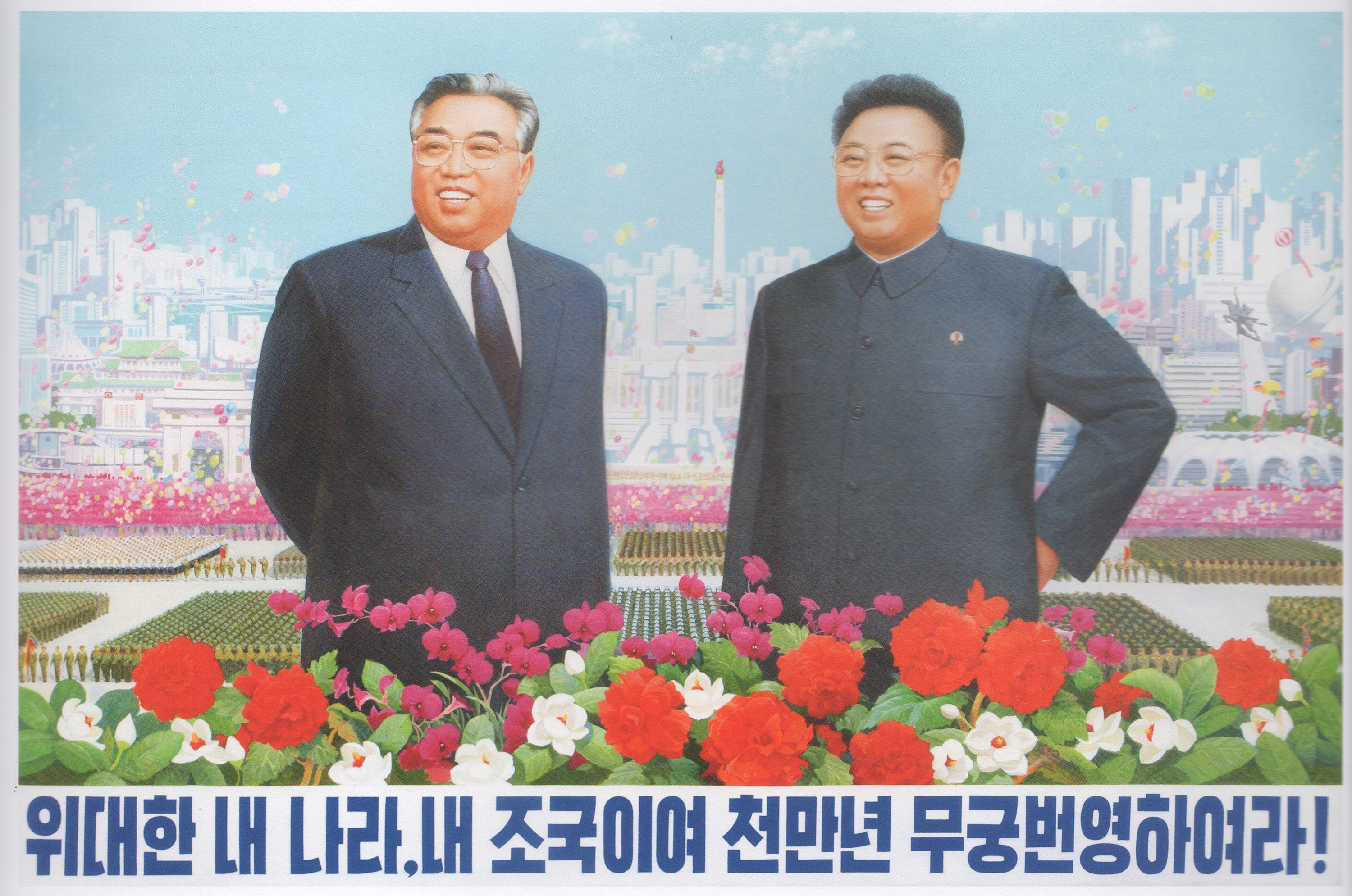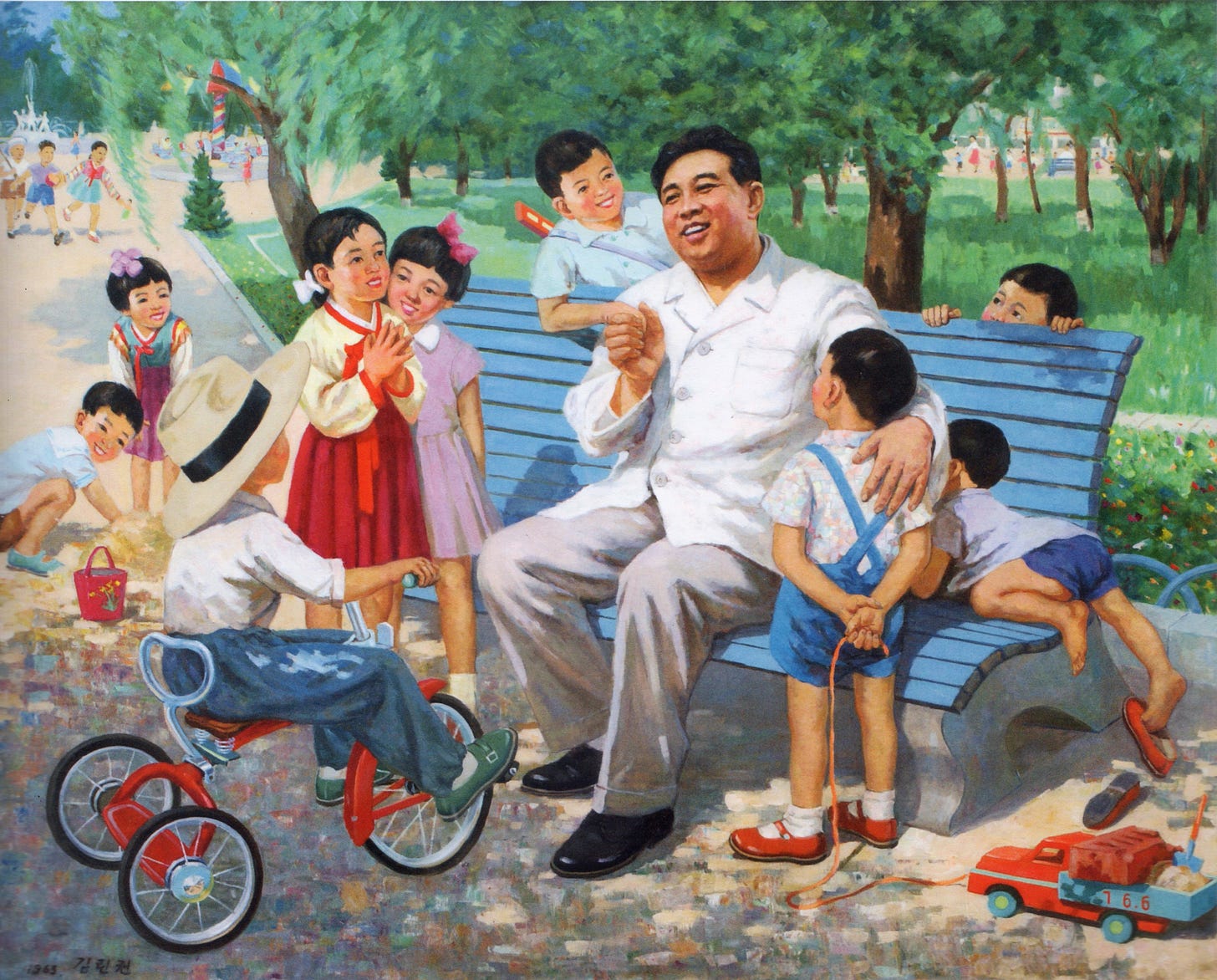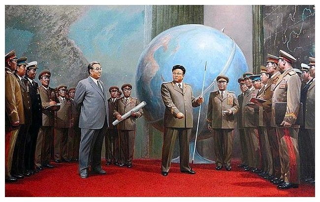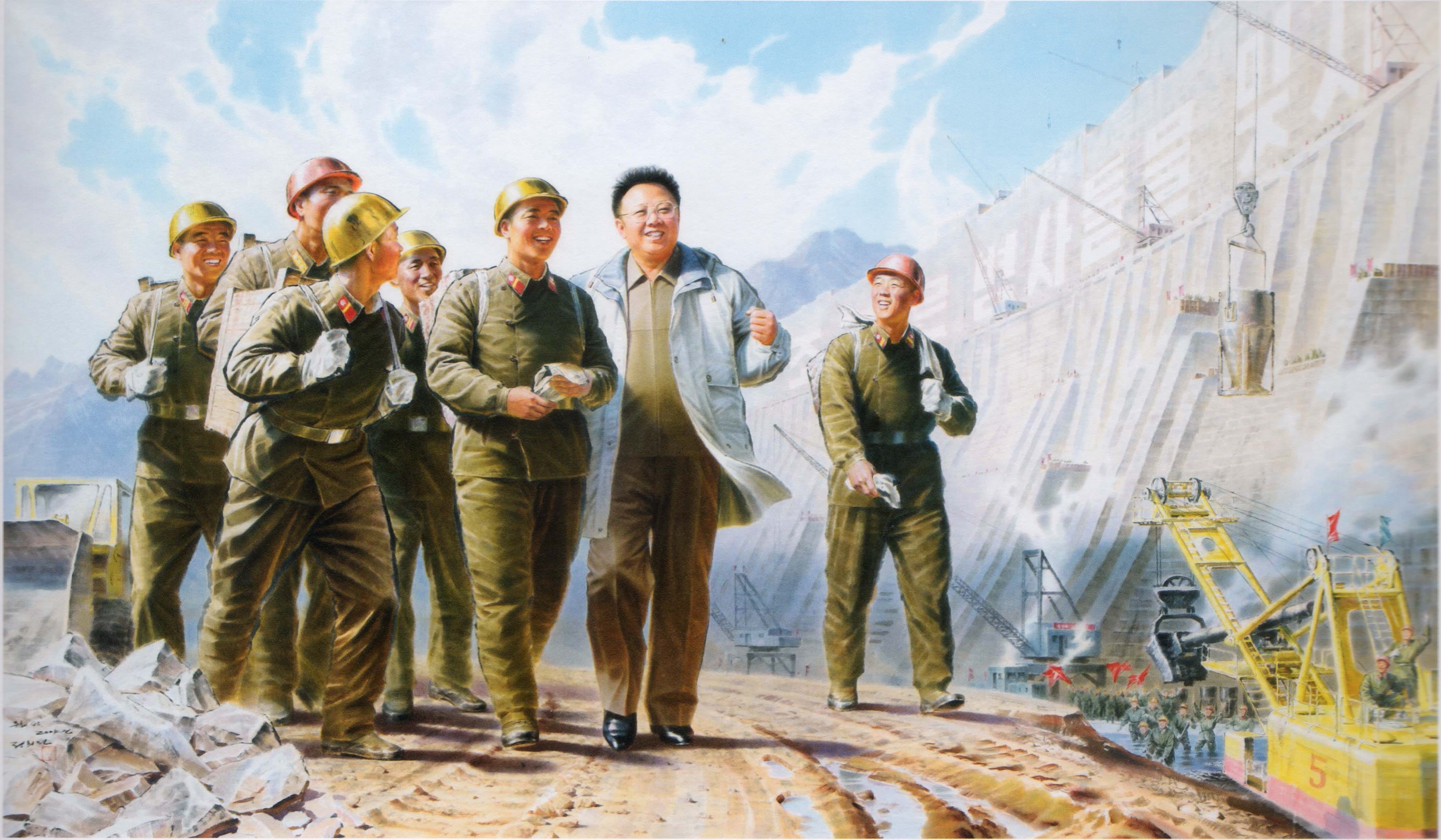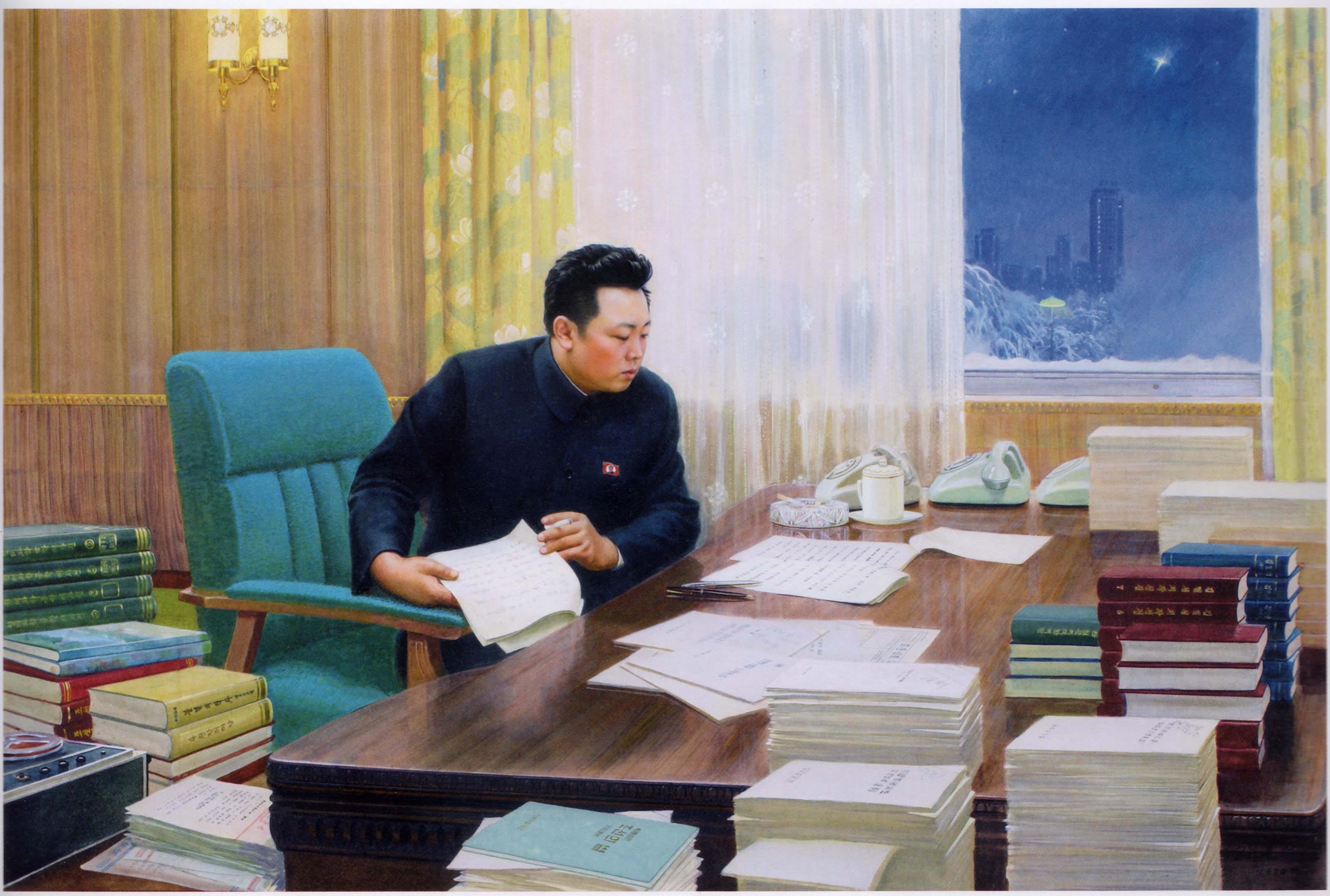 The Beloved Leader series takes direct inspiration from North Korean propaganda paintings rarely seen outside the DPRK. When I encountered these images I was struck by the contrast between their insidiously saccharine, buoyant, “Disney-colored” affect, and the cold reality of the world’s most severe totalitarian state. The iron-fisted Kim Il Sung (Great Leader) and Kim Jong Il (Dear Leader) were portrayed as kindly mother/ father figures, nurturing and protecting their happy innocent people.