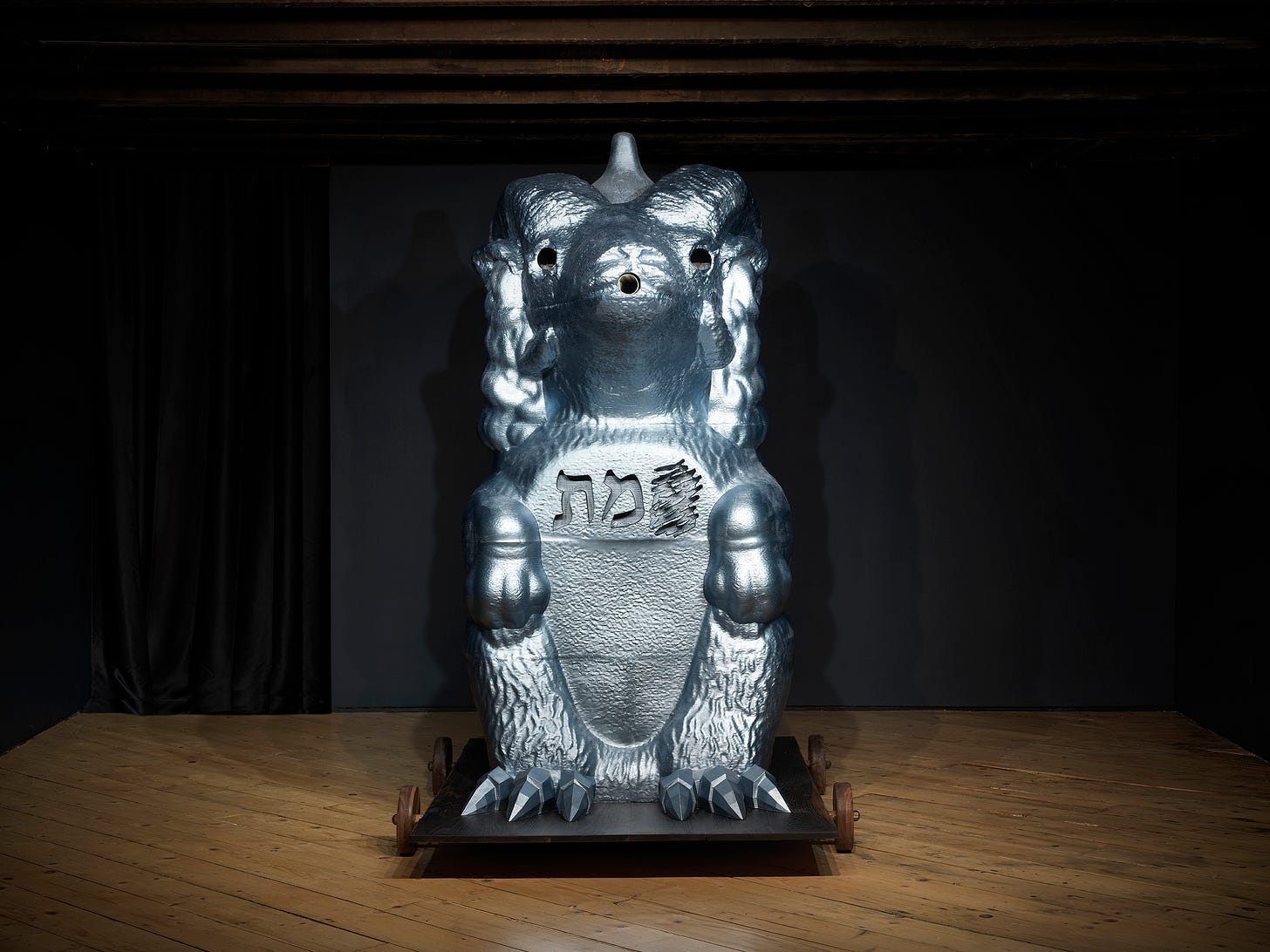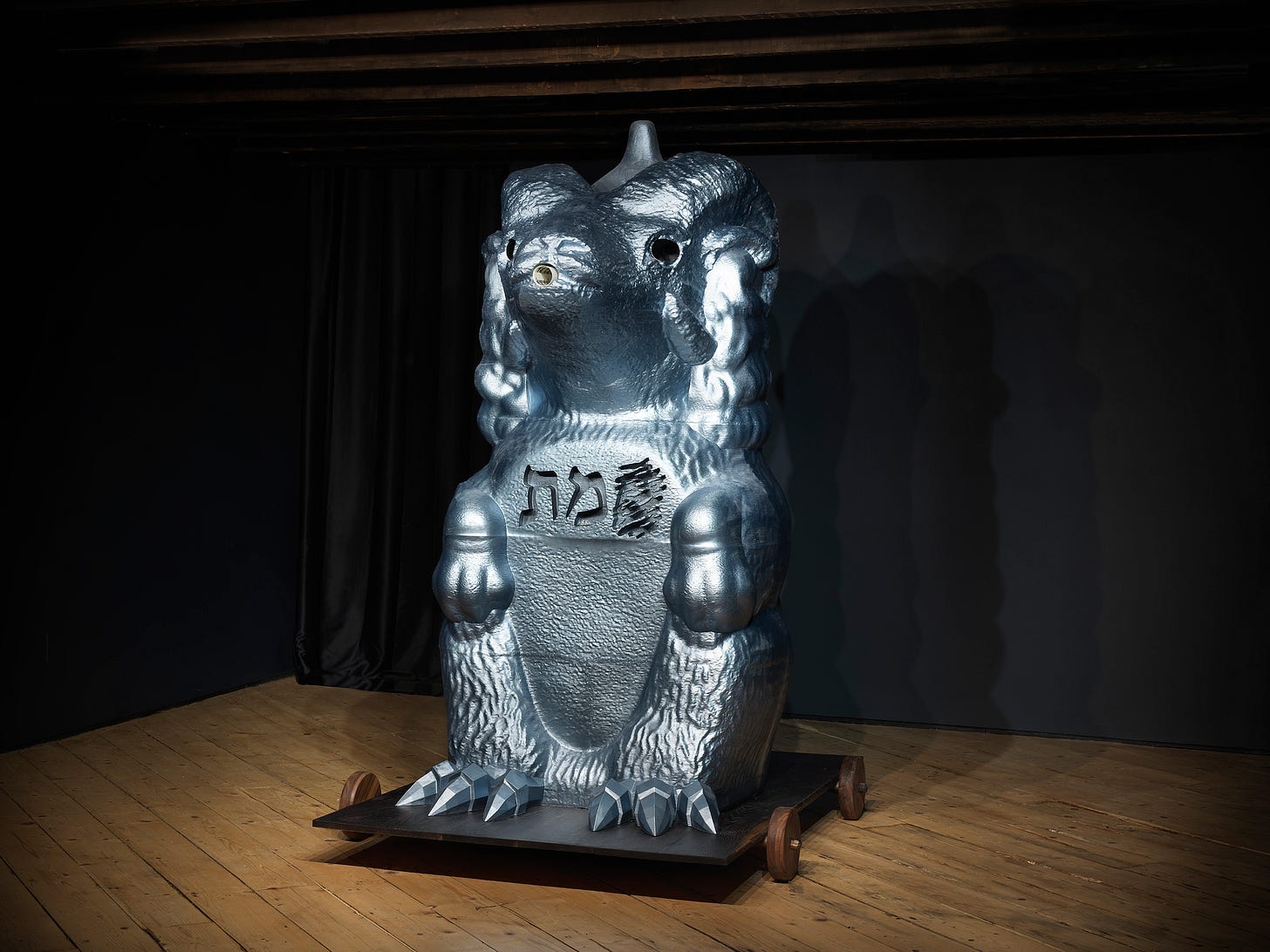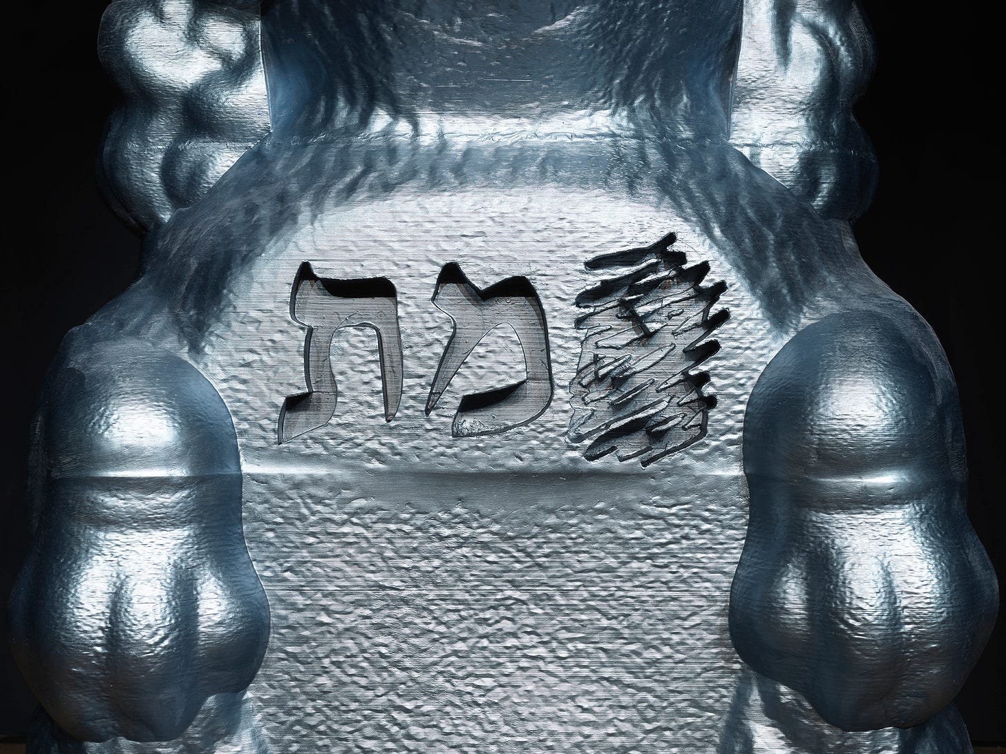 The golem stands over seven feet tall, iridescent and immobile. Its surface finish is a gleaming hand-made paint of K-500 medium, Cekol, and Iriodin 9605 Blue-Shade Silver SW. The golem does not move. Its mouth does not open — actually it’s crammed with pages repeating, “He can not call out to anyone with his mouth stuffed full of paper,” as if silencing it with its own rhetoric. Its chest bears the Hebrew word for truth — אמת (Emet) — but the aleph has been struck through, rendering it just מת (Met), meaning dead, like a silent monument to the historical lore that shapes it and the present in which it is situated.