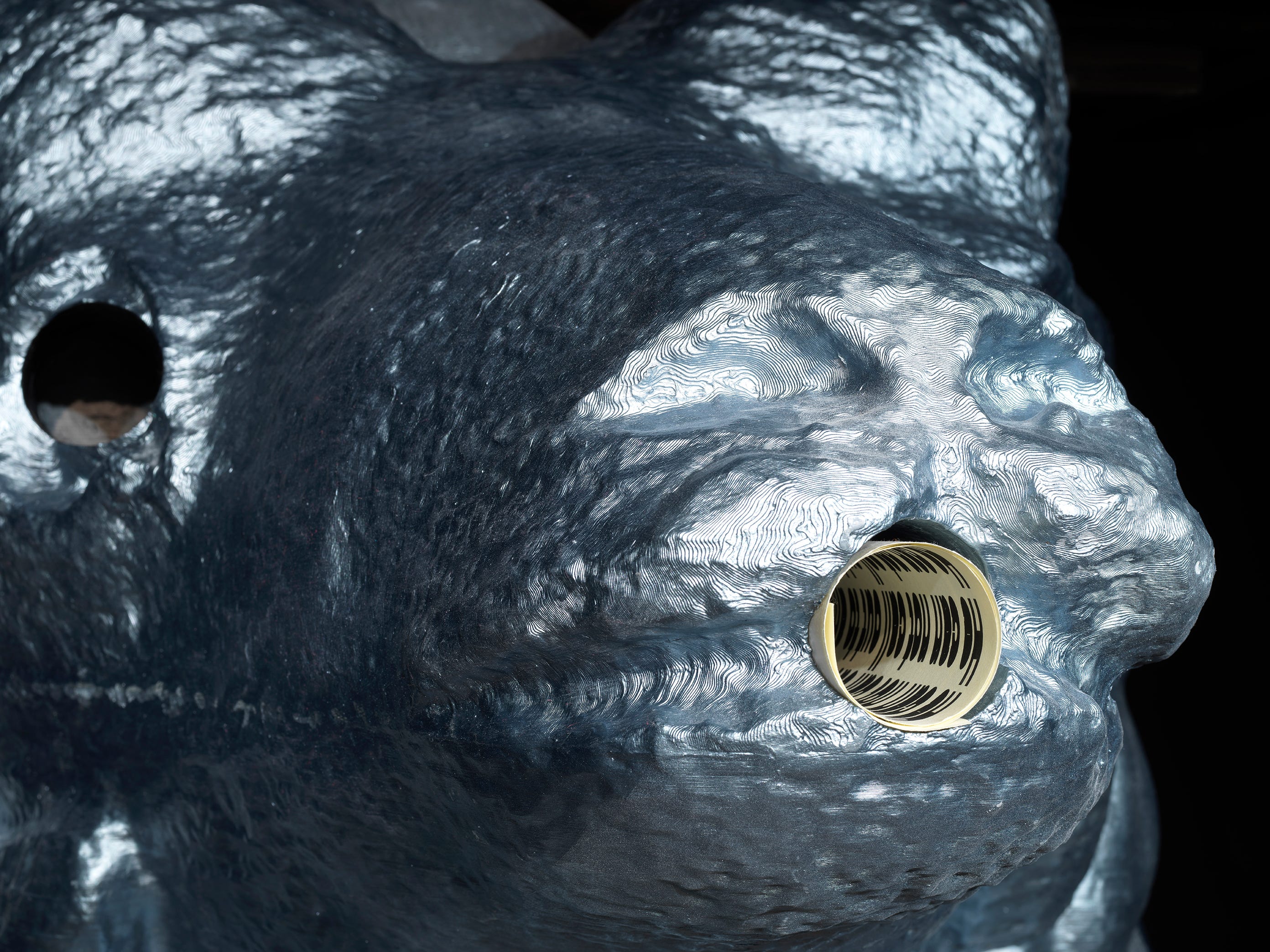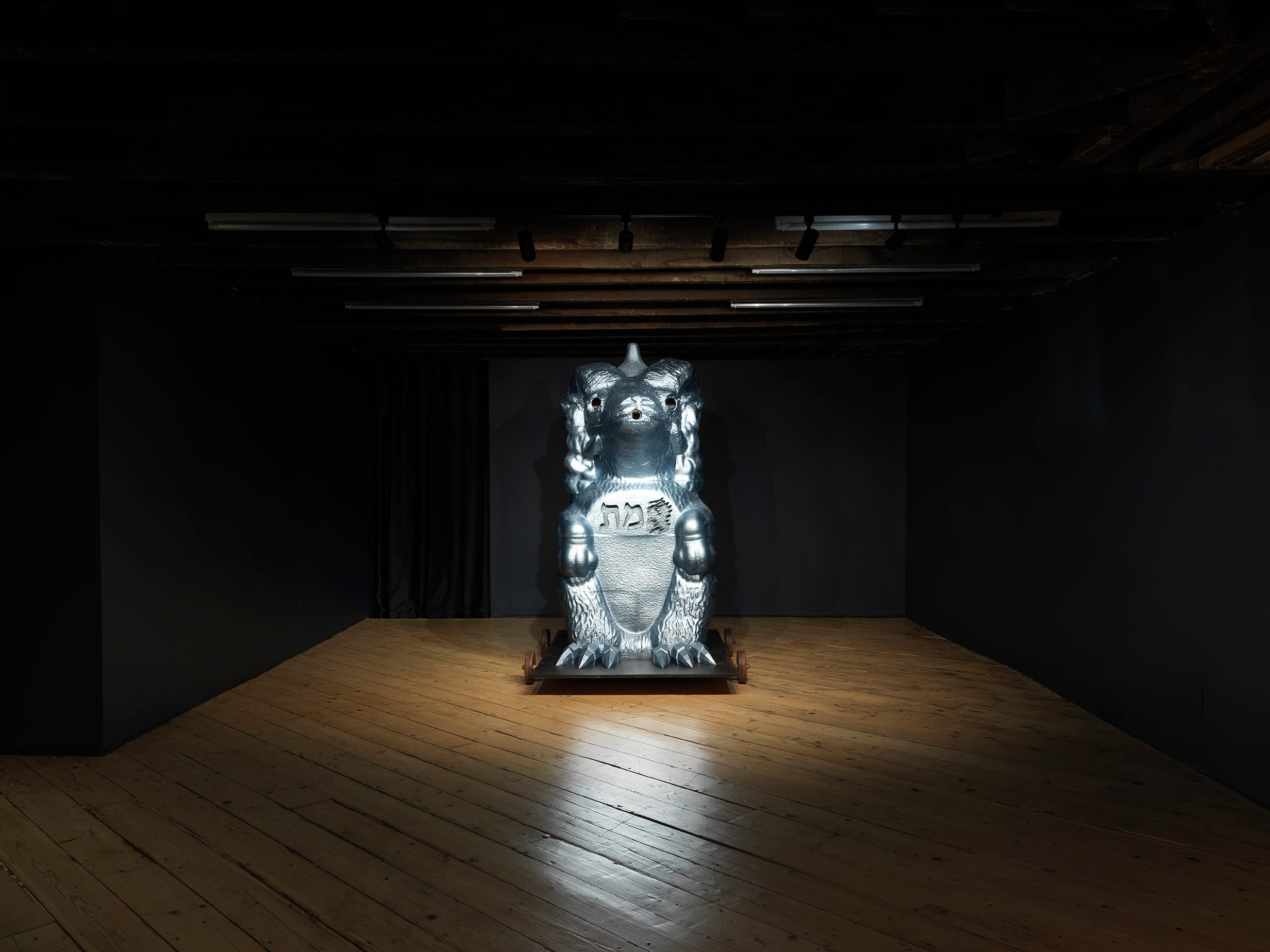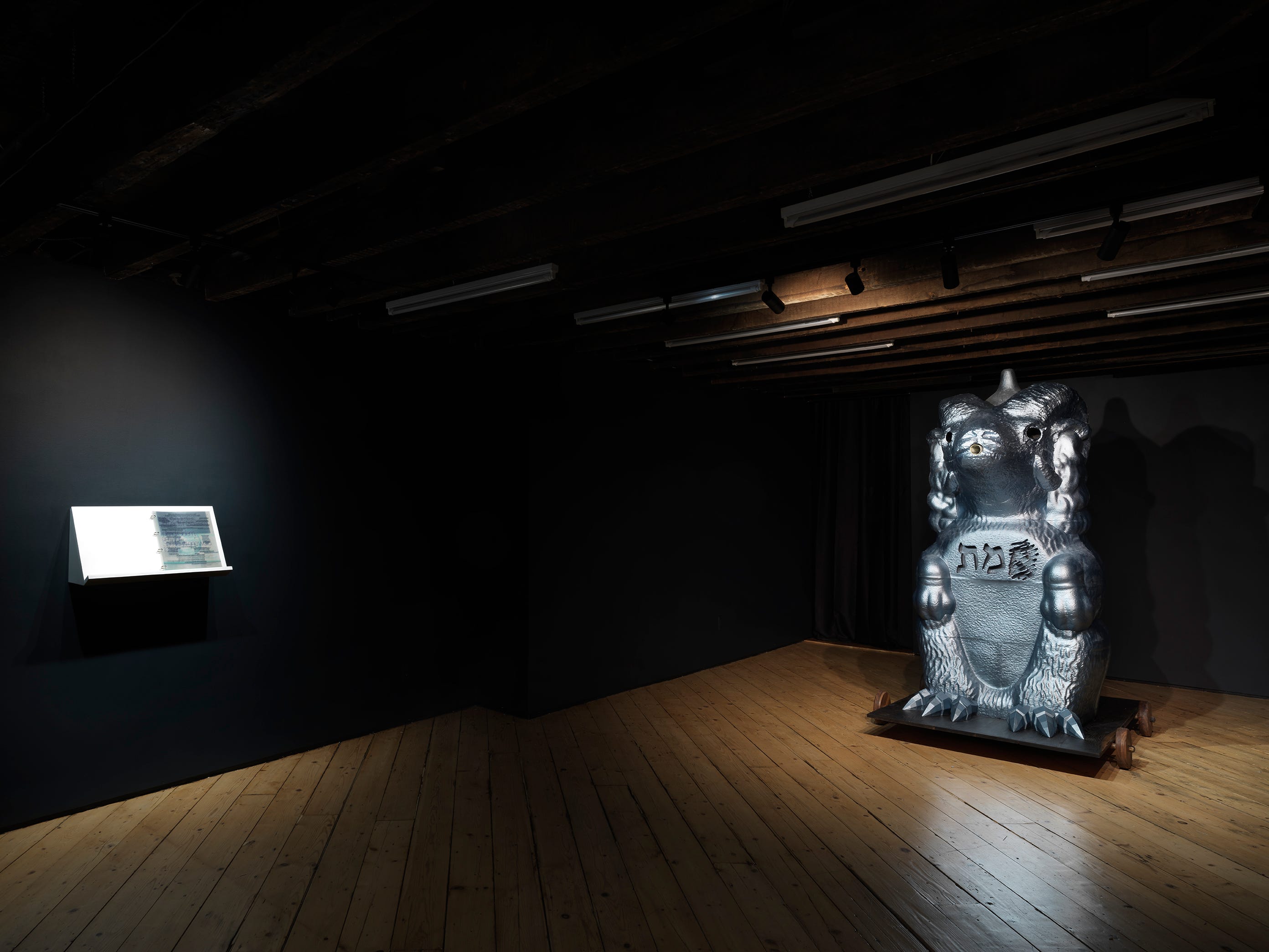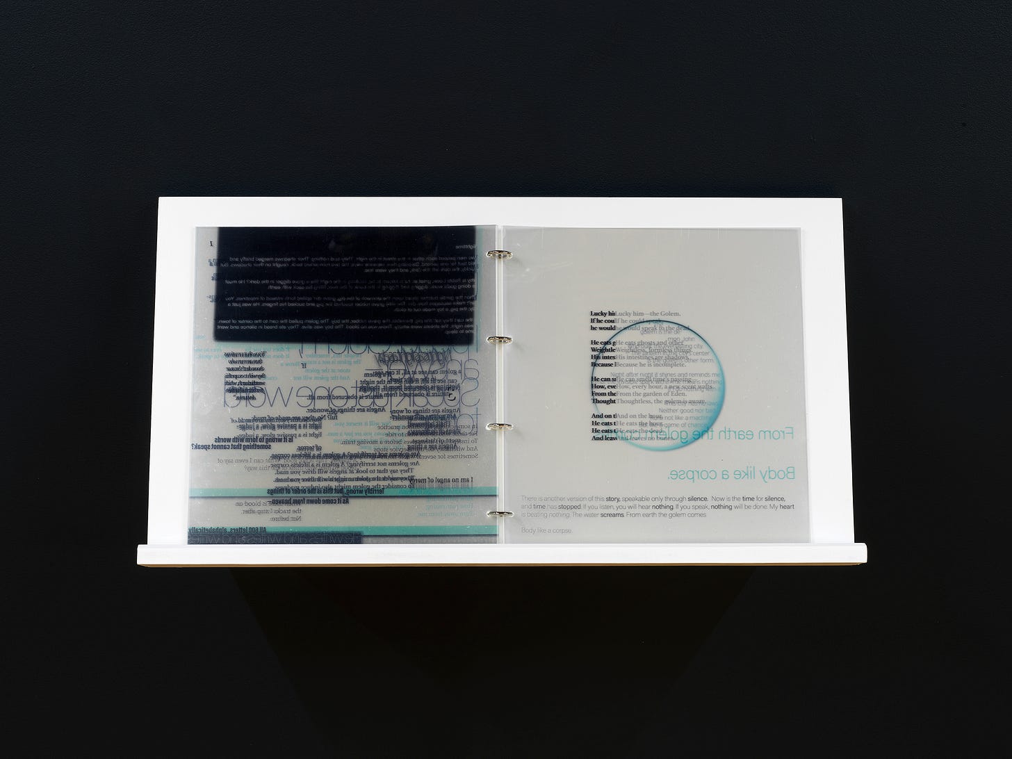 The golem stands over seven feet tall, iridescent and immobile. Its surface finish is a gleaming hand-made paint of K-500 medium, Cekol, and Iriodin 9605 Blue-Shade Silver SW. The golem does not move. Its mouth does not open — actually it’s crammed with pages repeating, “He can not call out to anyone with his mouth stuffed full of paper,” as if silencing it with its own rhetoric. Its chest bears the Hebrew word for truth — אמת (Emet) — but the aleph has been struck through, rendering it just מת (Met), meaning dead, like a silent monument to the historical lore that shapes it and the present in which it is situated.