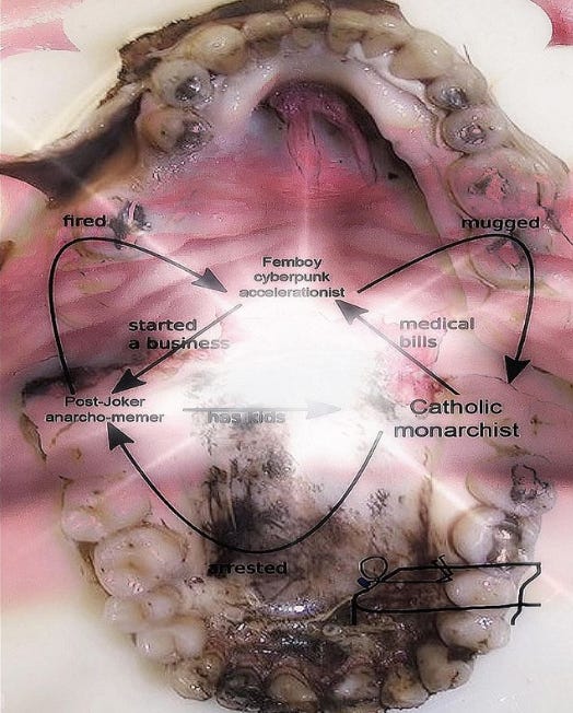 All this said, I’m optimistic that eventually something will break through. Even though many of these new spiritualisms have political upshots I often disagree with or find objectionable, they are forging the noble first steps toward reclaiming our ability to determine our own realities. I am personally drawn to a lot of the esoteric spiritual content I see from GOATed posters like DNR’s own Poorspigga and Vitruvian Grimace. Underneath the word/image combos is often a material resonance which connects my own experience of late capitalism in the internet age with newer or at least less mainstream ideas of spirit. I can’t say that they’re objectively better just because I like them, but at least they’re doing something new. I’d love to be able to say that Gnostic Accelerationism or Leibnizian Calvinism is the ACTUAL spiritual understanding that would lead us towards freedom, but I think the answer to the spiritual problem is probably a materialist solution. It seems inevitable that eventually there will be a narrative of reality that makes sense of the alienation of modern life through analysis of historical/material conditions and understands us all as pieces of God. InshAllah, we all become the cool kids in a heaven on earth.