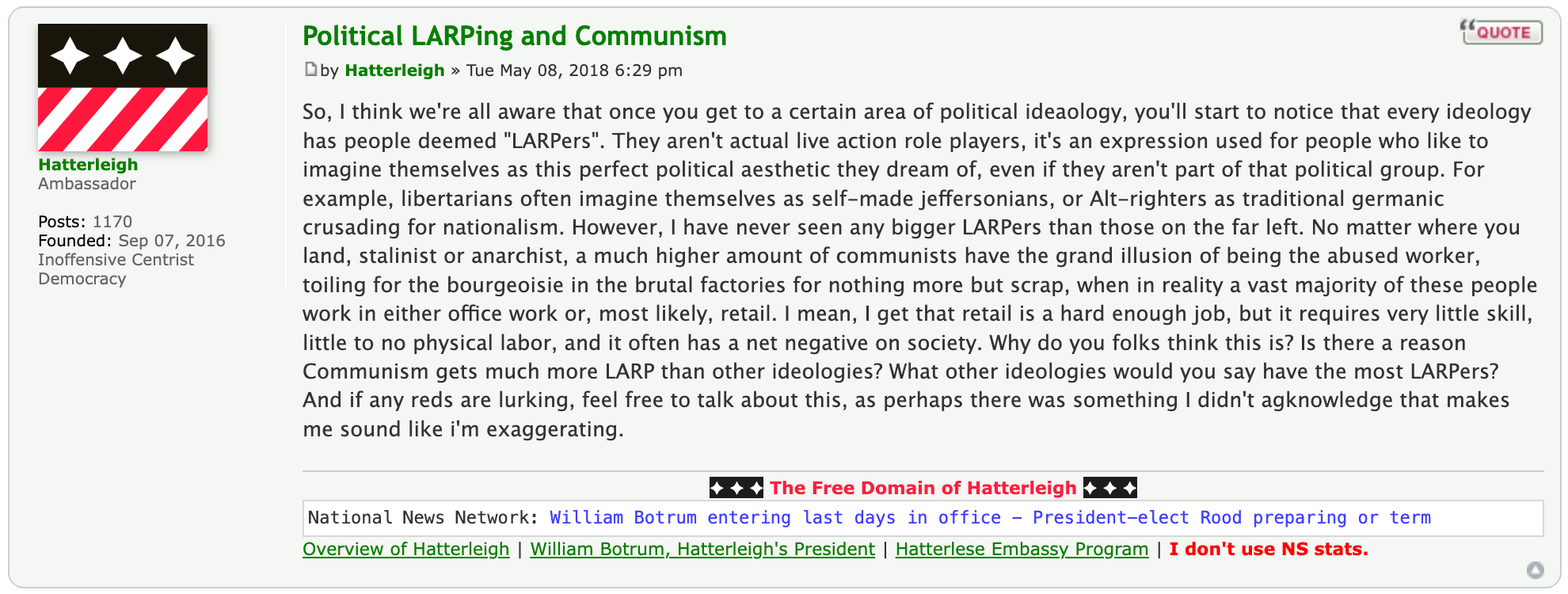 “What we on the Left flatter ourselves in calling our political and even our revolutionary work is in fact nothing of the sort. It is more akin to religious ritual. Mass rallies, newspaper sales, endless meetings, electoral campaigning, street fighting, writing articles that no one will ever read and books absolutely no one will ever get any practical use out of … In another time, in another place, these rituals may have had a relationship to a broader movement, a broader strategy, and such stirrings have always accompanied revolutionary moments. And so, having no real conception of the thing itself, we try to grasp at revolution by playing out its inessential weirdnesses ad nauseam. This is what comes after farce. This is LARP.”