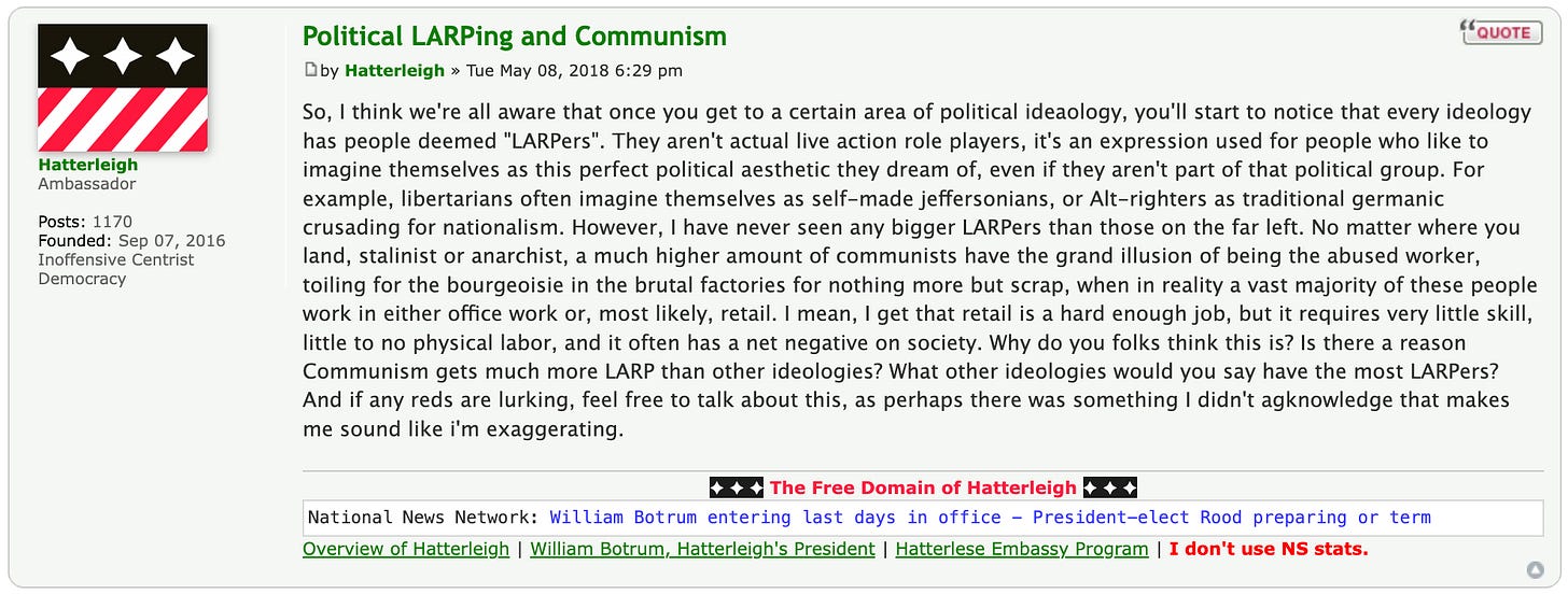 LARP refers to “live action roleplaying”, a genre of roleplaying game where a fictitious world with its own lore and internal logic is mutually agreed upon by multiple players. Each of these players acts out a character within this world and, through their characters, engages in dialogue with one another. Perhaps the archetypal example of LARPing describes the sorts of historical re-enactments one would find at a mediaeval fair, but the term has been used with increasing frequency to describe people’s relationships to extreme political alignments. This essay is an inquiry into why LARP has become so resonant for understanding the aesthetics of specific political and cultural phenomena in the 21st century.