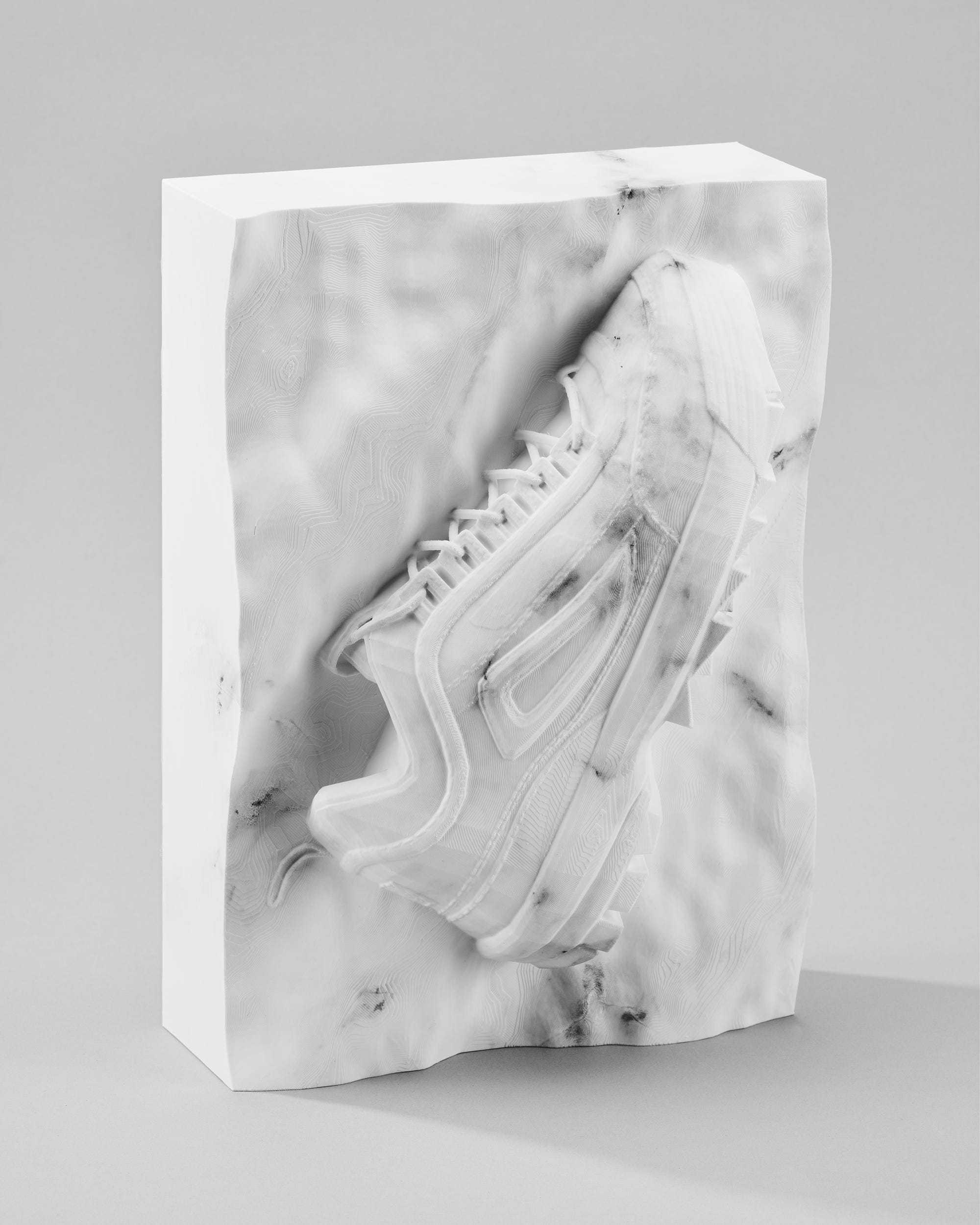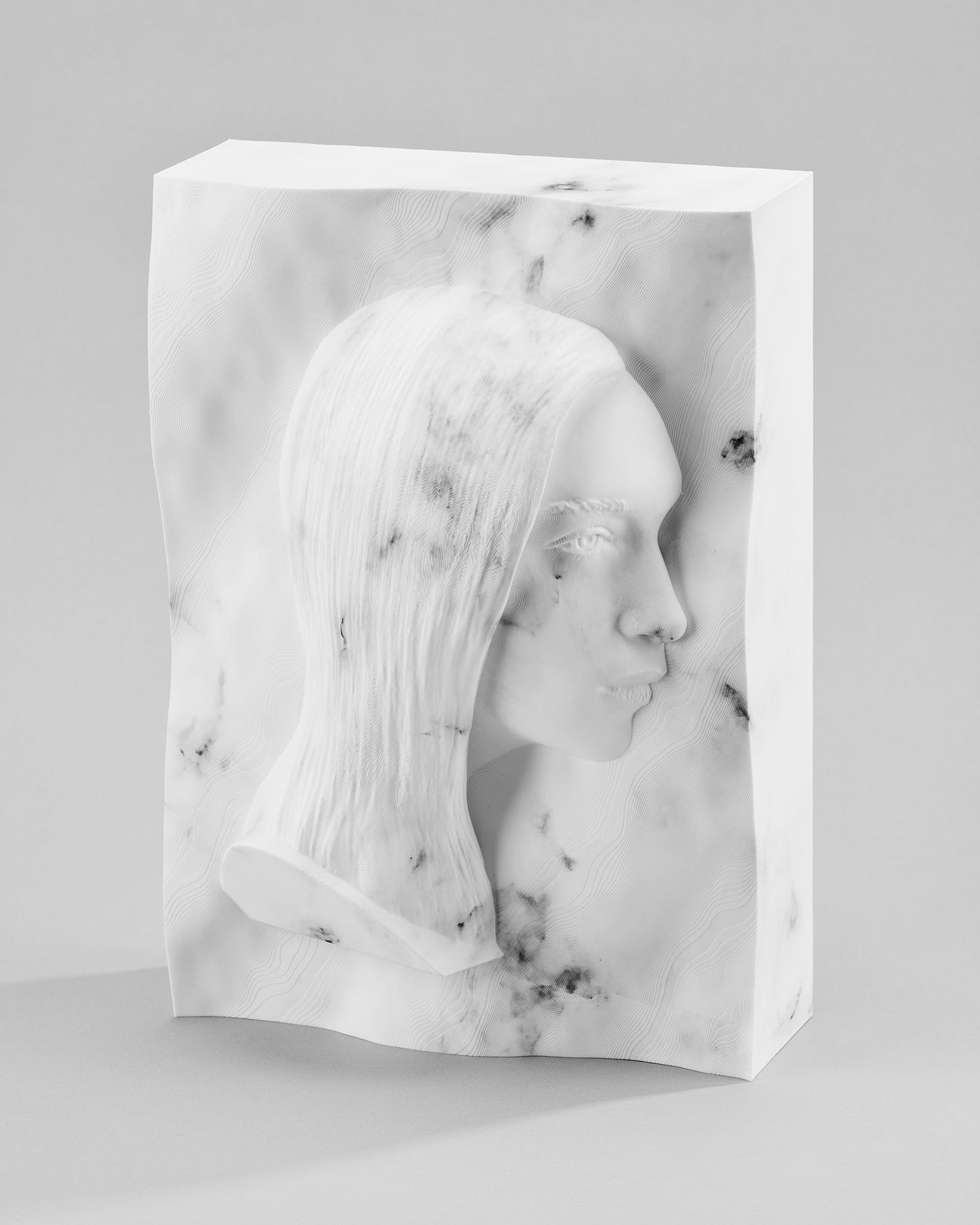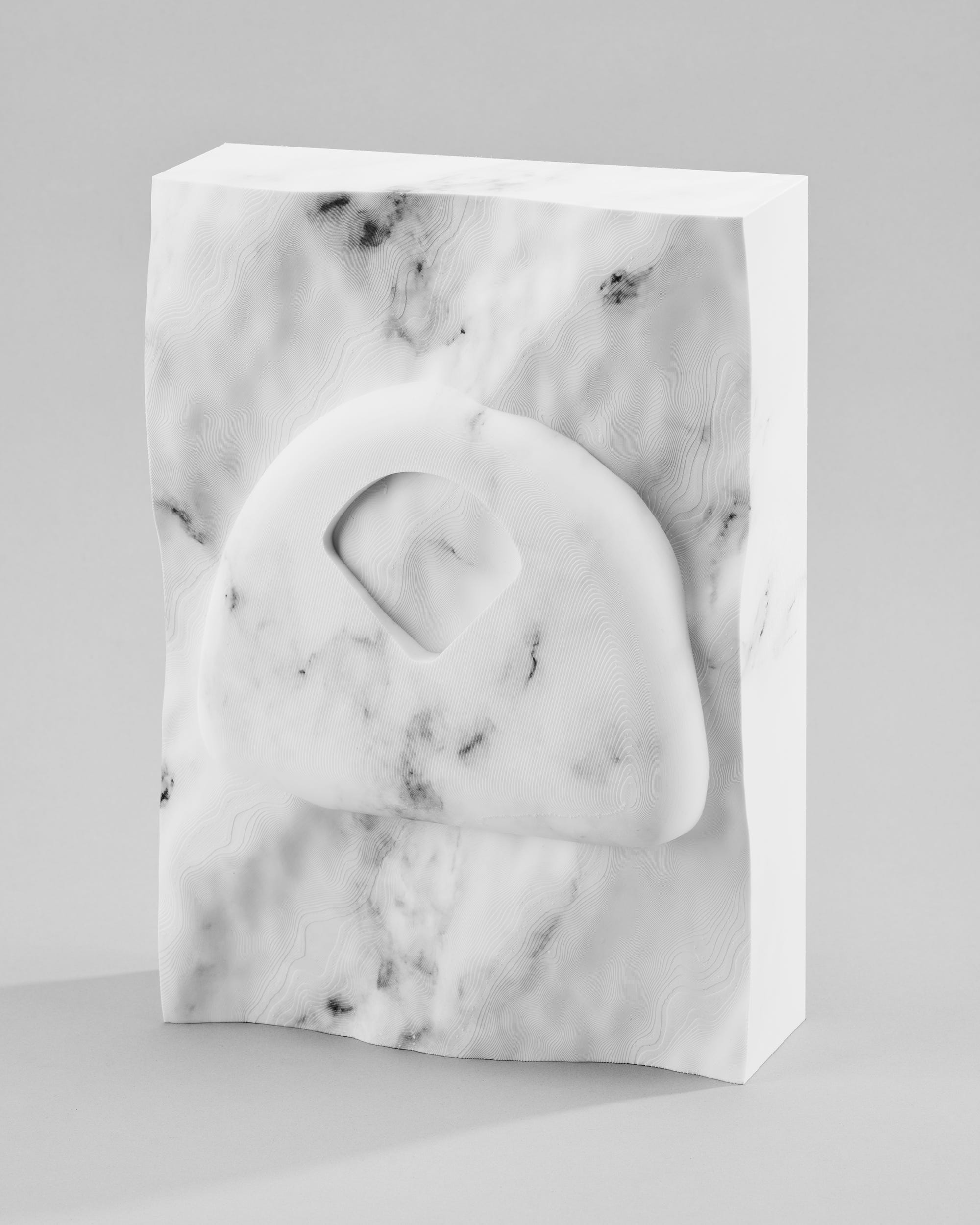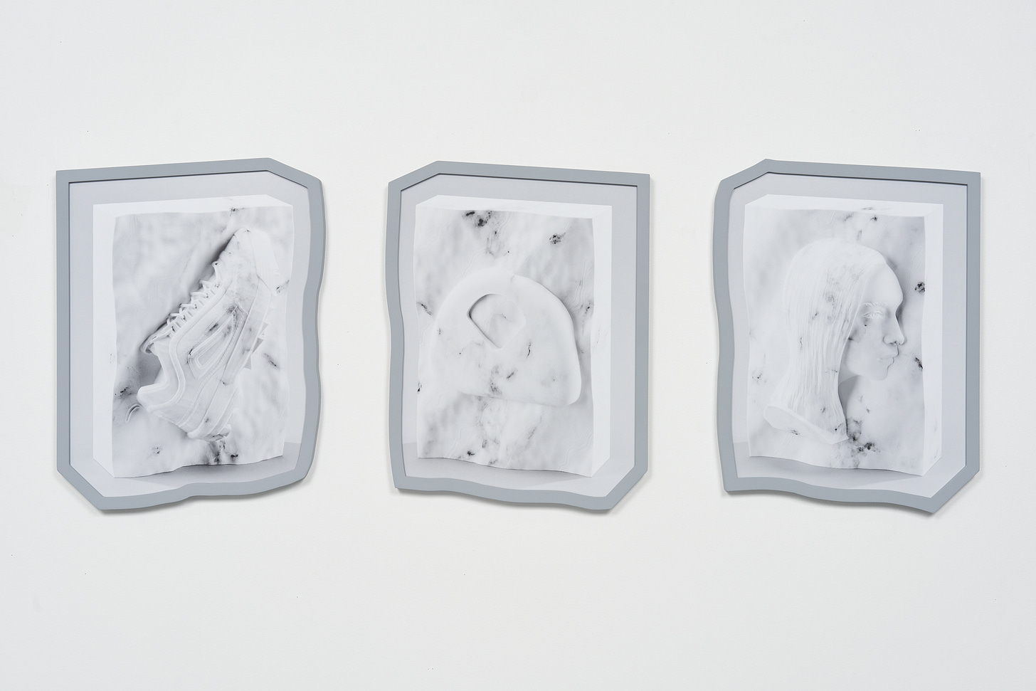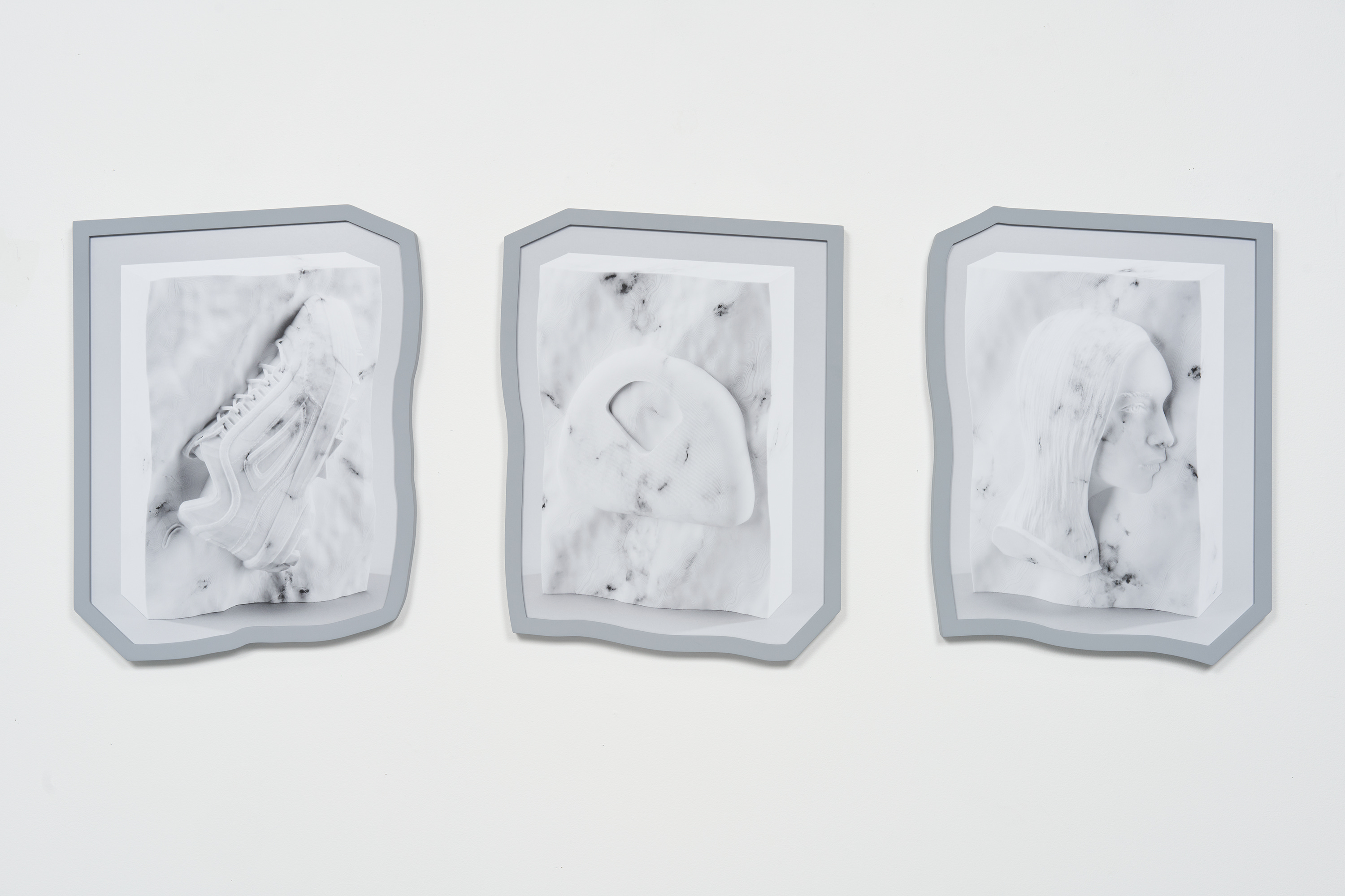 These subjects, reliant upon the favor of algorithms to dictate their visibility, have been converted into pseudo-artifacts and embedded in slabs of marble. Paralleling their calculated online distribution, false marble bases have been constructed using Blender’s procedural marble node, which relies upon a set of algorithms to replicate organic textures. After being 3D-printed, the sculptures are wrapped in a hydrographic print of an Adobe Stock marble texture, endowing them with an additional layer of artifice. The sculptures are then photographed, printed, and enclosed within frames that trace the outlines of each marble slab’s perimeter. The steps of translation within their production engage with the slippery state between image and object, where subjects are reduced to a flattened, two-dimensional state that often counters their material existence.