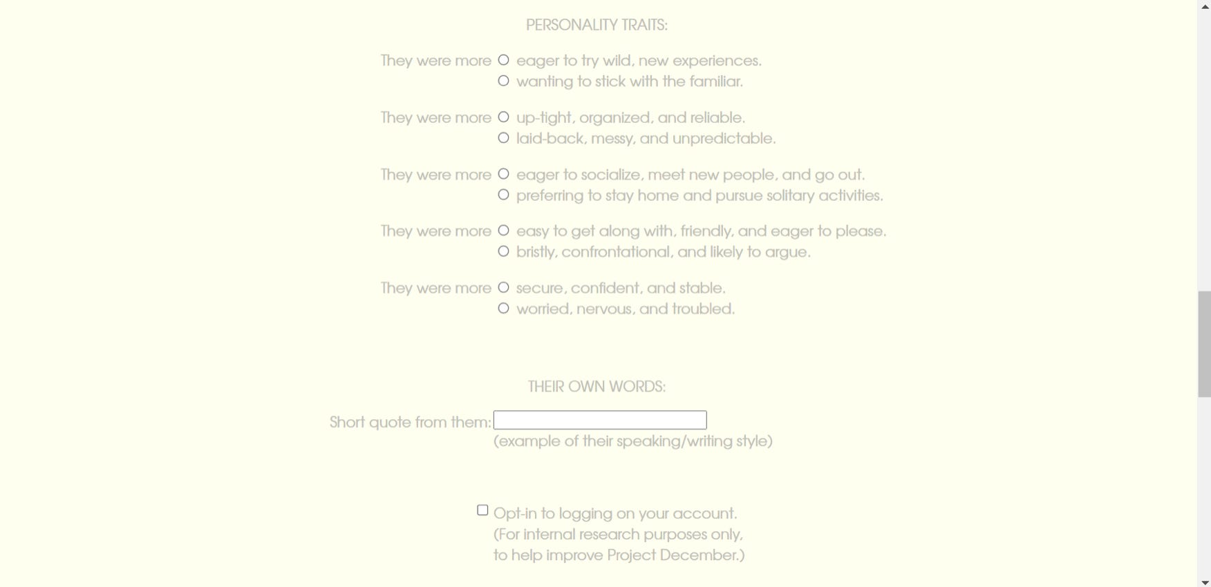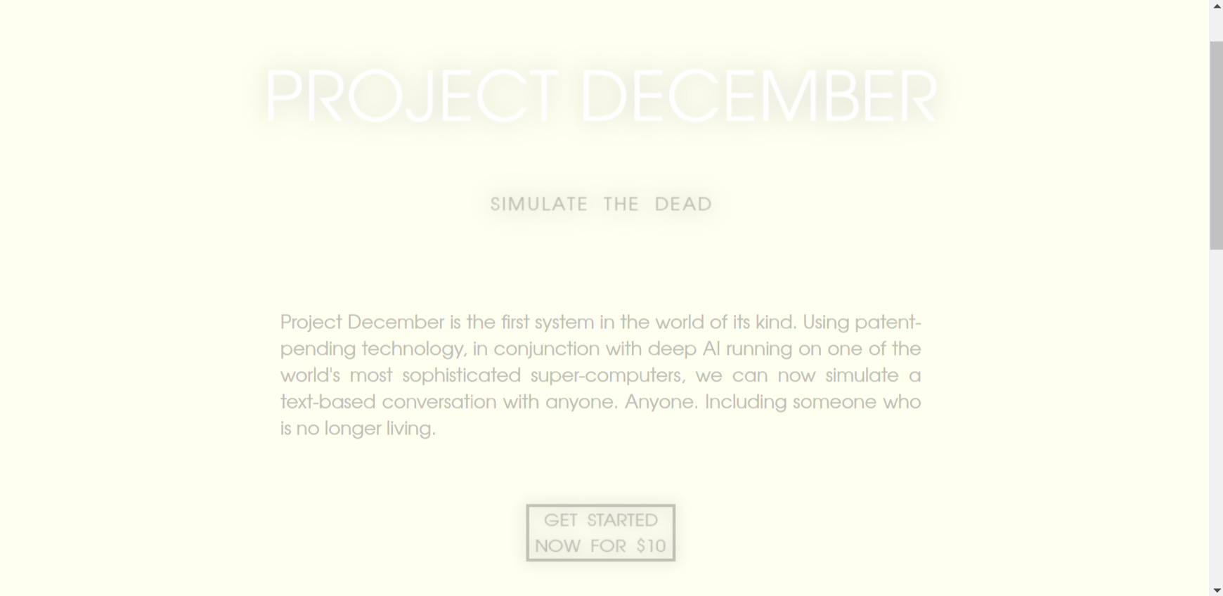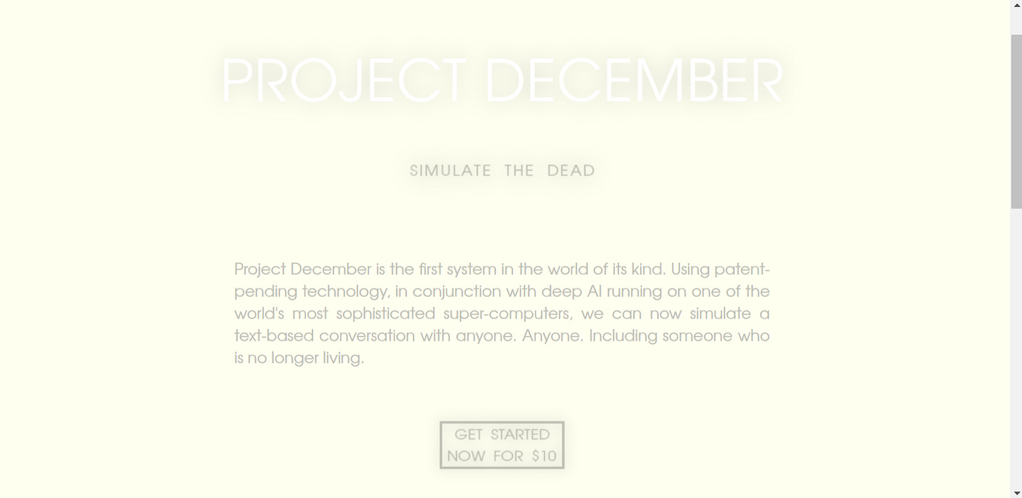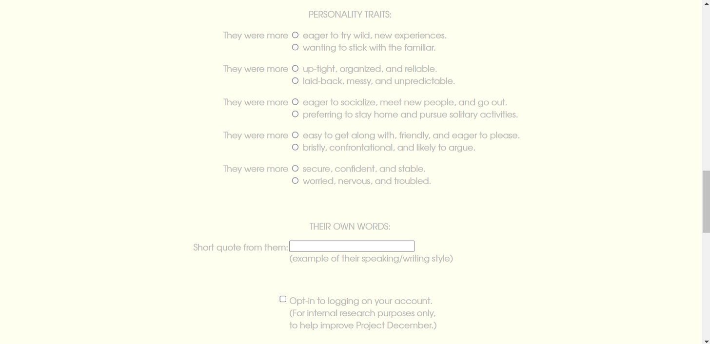 In contrast, Project December is trained on data intentionally input by the bereaved about the dead, but places other constraints on the type of data used to construct the thantabot. (9) Users are given the opportunity to recall memories of the dead in the form of their own remembrances, instead of using the data artifacts left behind, thus creating a more personally crafted entity to interact with. This process is akin to the renegotiation process described above, though framed in the logic of individualism rather than collective processing. However, other forms of constraints are placed on the construction process, with personality traits being defined through predetermined binaries, and limits on interaction time. Project December is a paid service offered by OpenAi. The website states that for $10, “your conversation will included over 100 back-and-forth exchanges and will last an hour or more, depending on how quickly you respond and how you spread your conversation out over time”