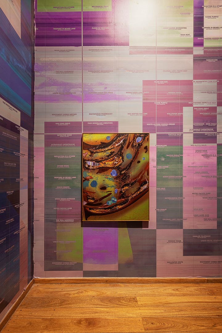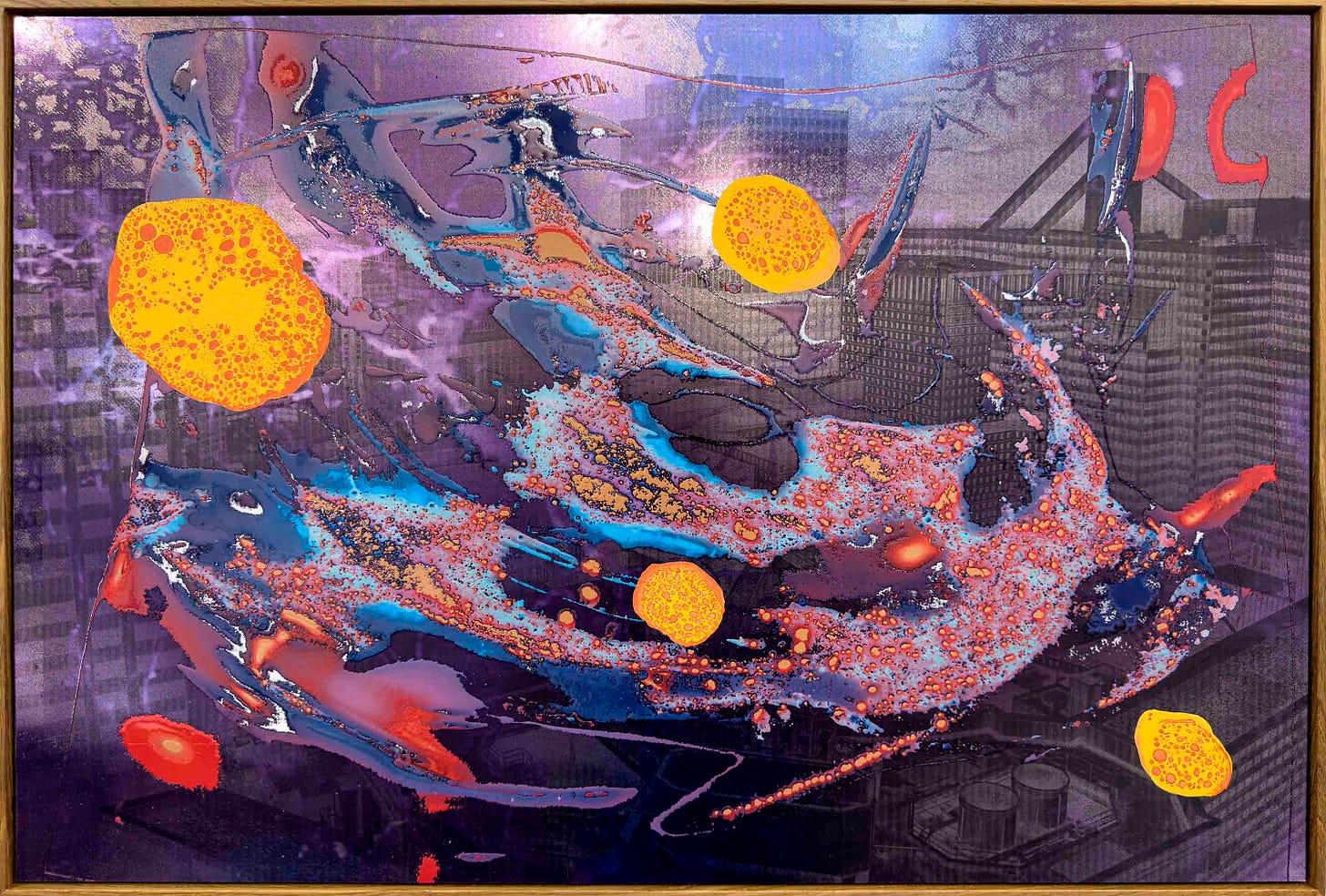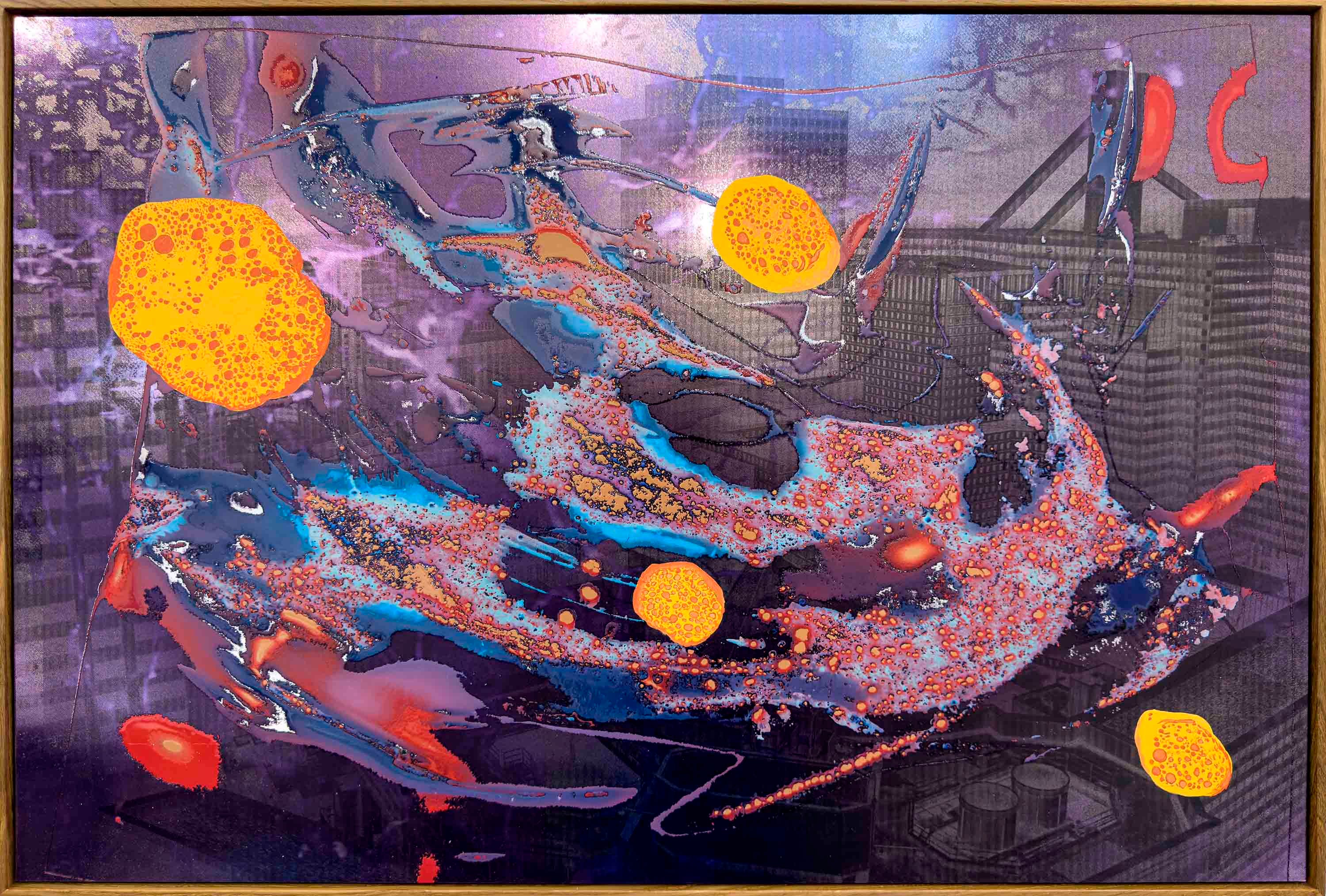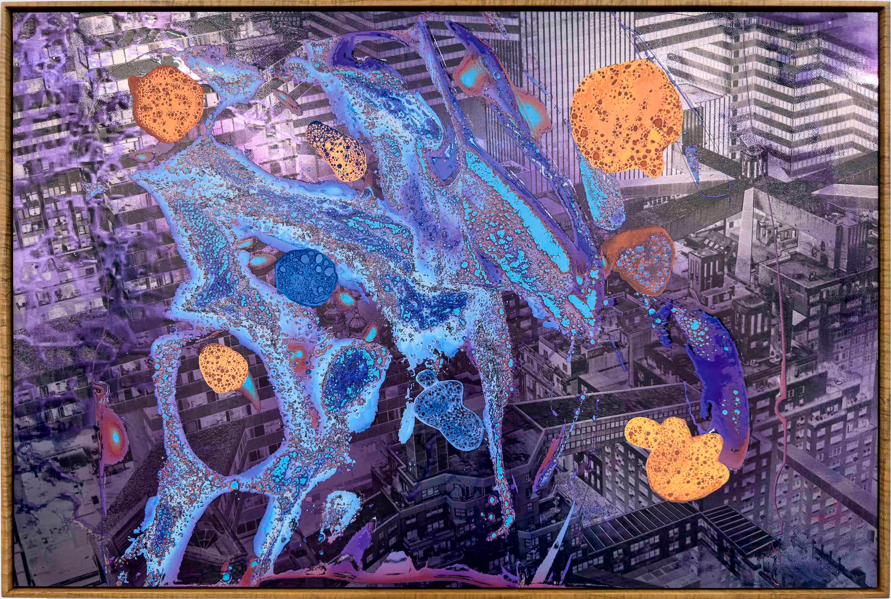 Brick Paintings utilize redundant methods of technical reproduction, from drone cameras, to film, to screens, to monoprints and more. These granular distortions are then layered with varnish or oil paint and juxtaposed with abstract chemical reactions to challenge our traditional notions of the technological and the natural. Their substrate, mirror-polished aluminum, reflects the viewer and fractures their visual field, turning the paintings into both object and lens.