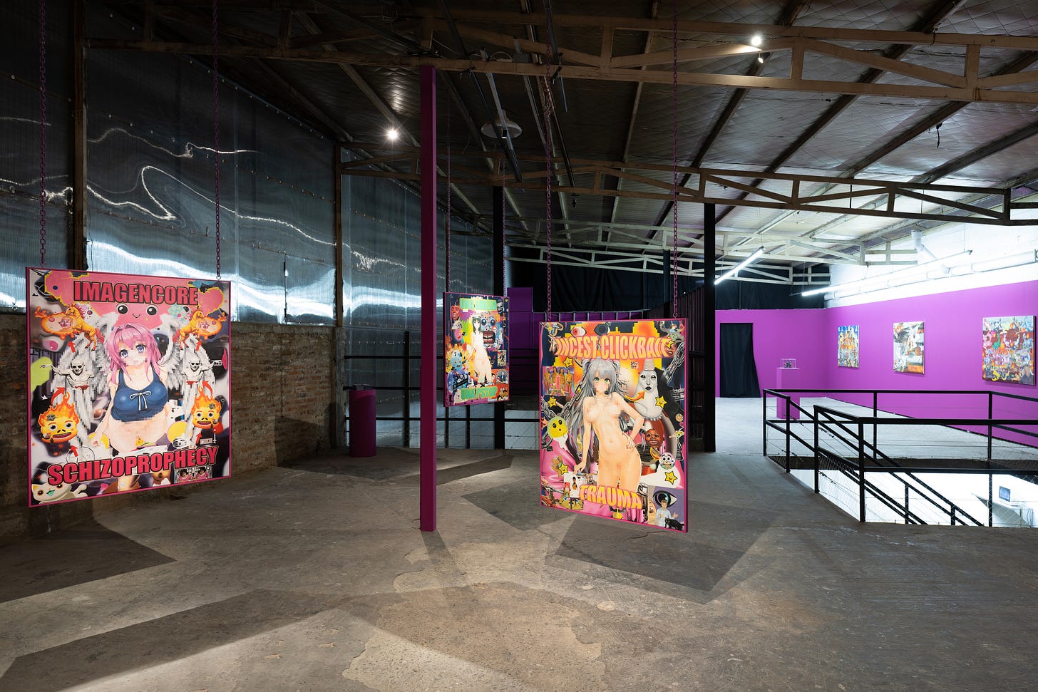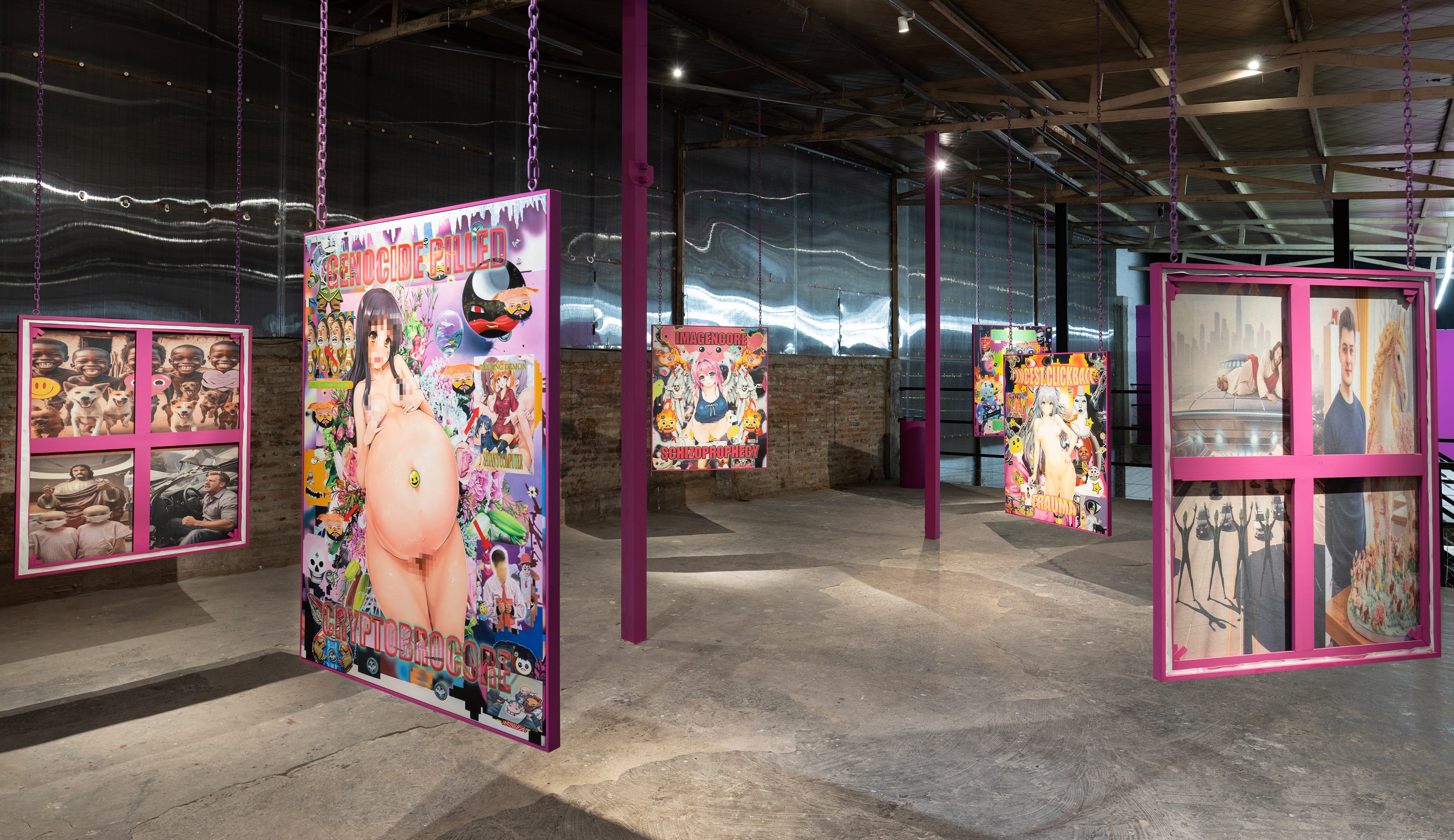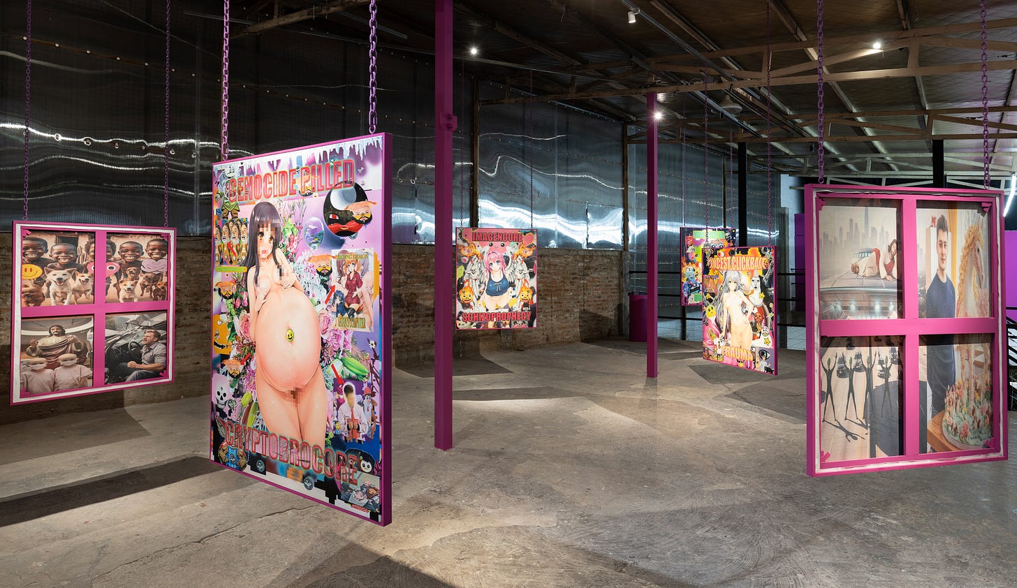 The exhibition takes its title from its central inquiry into the entanglement between desire and the online sphere. Brangold’s recent paintings are organized into two bodies of work: The 8 Seals of the Apocalypse and Thanatos and Ferals. The first series originates from digital processes in which multiple AI models, custom trained on a large archive of contemporary online aesthetics including niche memetics, shitposting, conspiratorial diagrammatics, and nonsensical brainrot, are recombined into synthetic collages. Thanatos and Ferals draws on a widely circulated AI model employed within online communities to produce furry themed pornography; Brangold extracts its two dimensional characters and overlays them onto generative collages constructed from open source databases of natural disaster imagery.