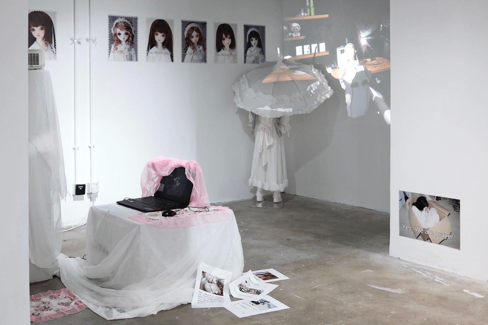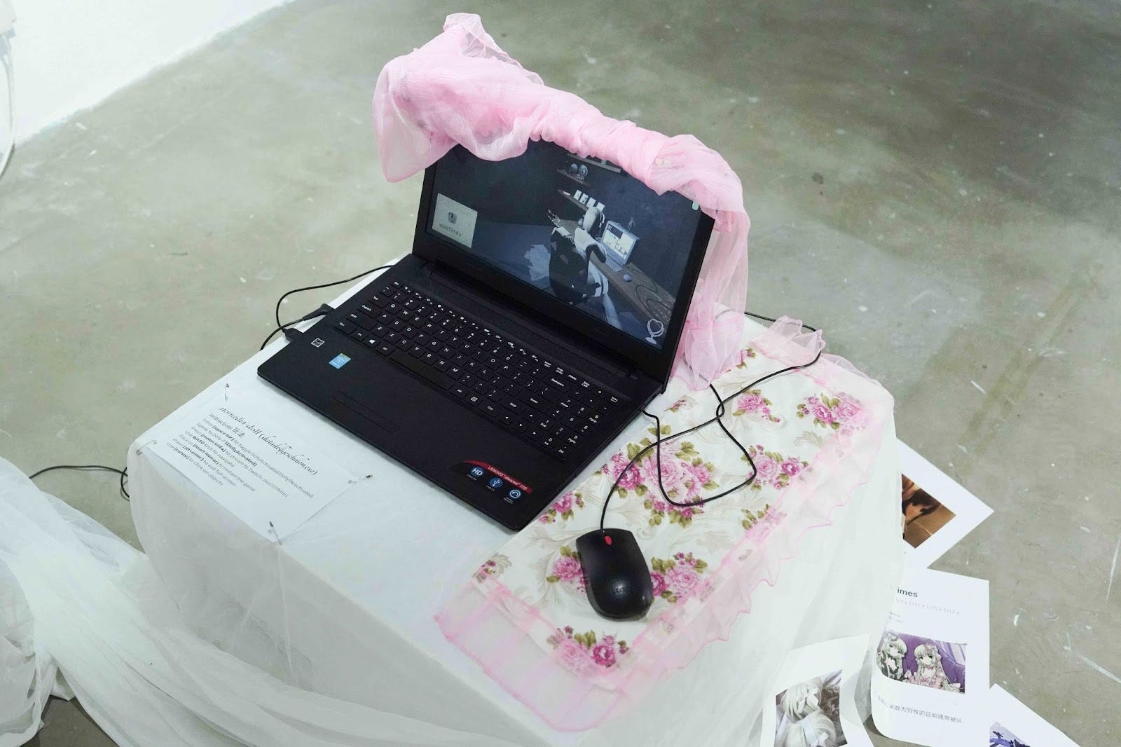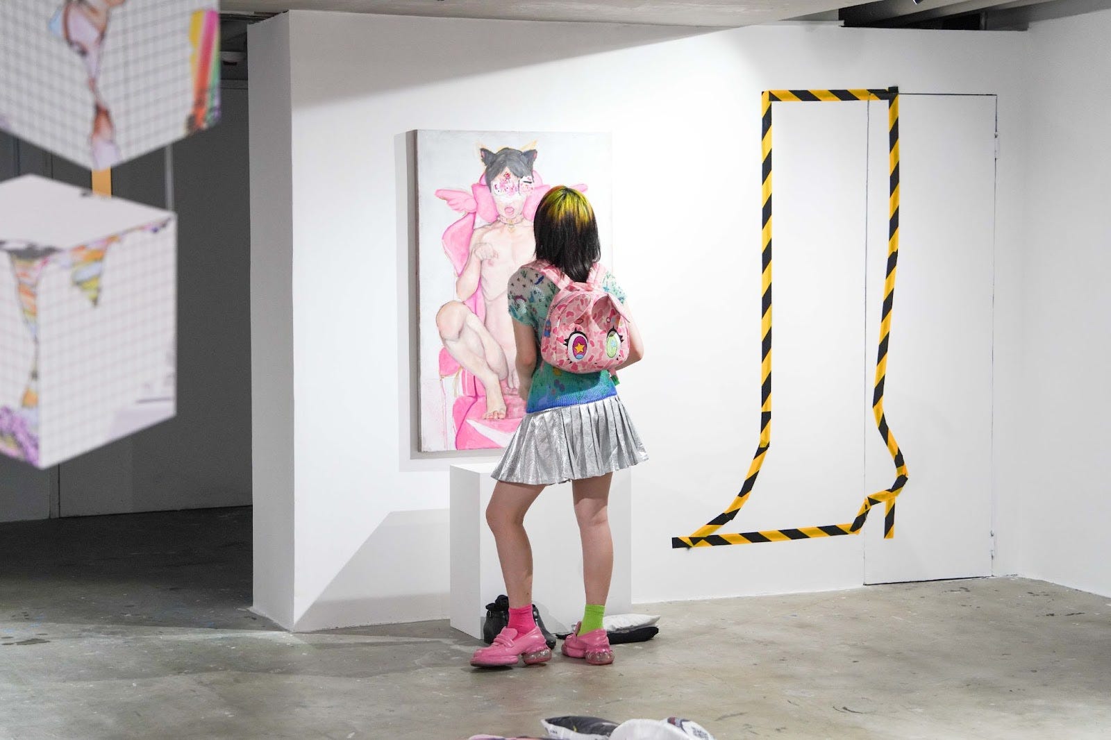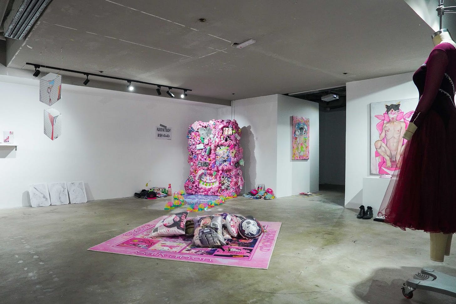Contemplating the cringe vs based matrix, low and high-end culture, Ringo Lo observes in a game of Taiko no Tatsujin (太鼓の達人) the exhilarating beats and flat lyricism in EDM songs. The storytelling devotee iterates an unpredicted sentimentality, a sensual flow within the chaos of his stimulants-coded, wall-hammered text—but that is yet to be undermined by the theatrics of the mannequin that shares its space. When distractions overwhelm, the artist is determined to decipher. A lover of love, the idyllic, and alternative modes of care and intimacy, E8mkboy channels its fantasies—fairy tales often featuring leathered-up dominatrixes and its doe-eyed, bondaged, submissive and breedable self—online and in paintings. The little pet takes comfort in domestication as part of everyday rituals: in a mural painting detailing house rules of subordination, in a self-portrait of its docile self being fed on a gaming chair. It does not claim to be a femboy nor catboy, contrary to popular assumptions, and whether or not their stories are authentic is of unimportance.