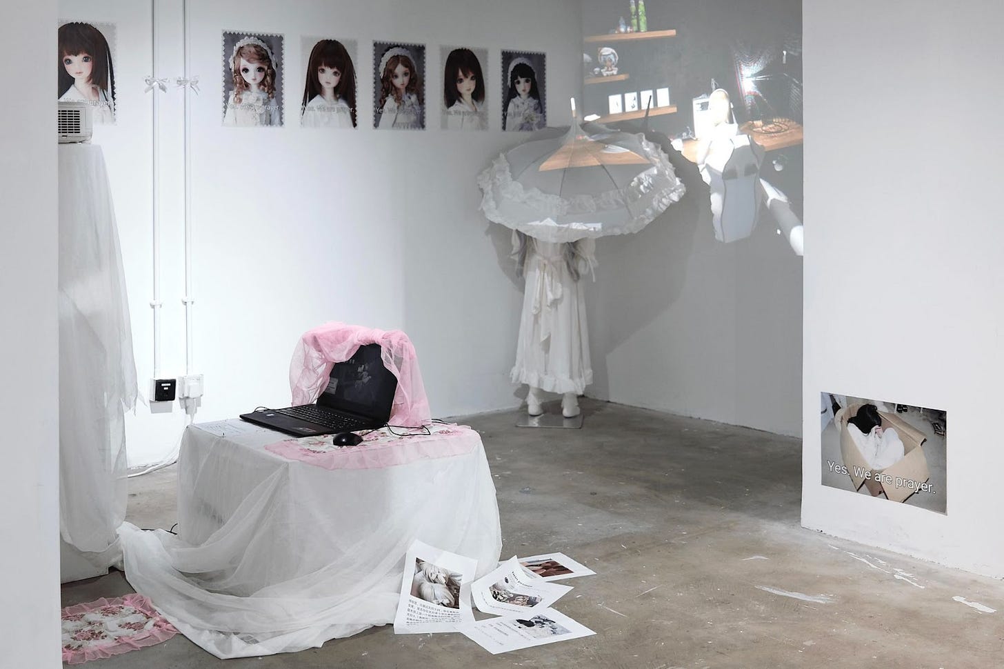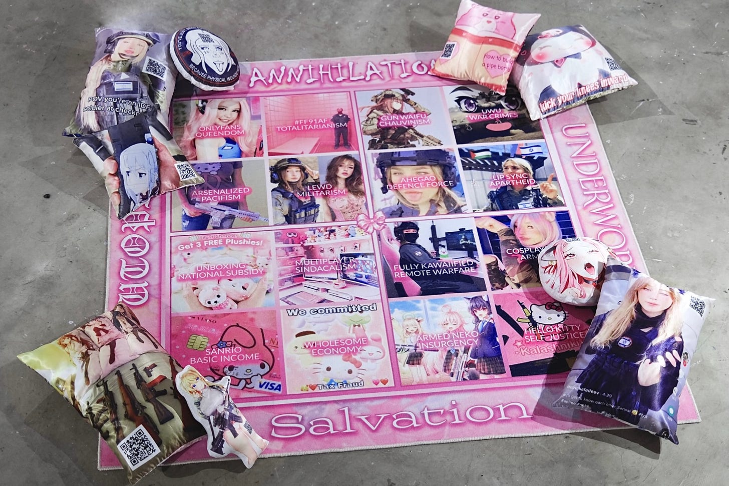 Inventing a hyper-citational room of exe file, data-traces, and cross-spatial twitch stream, data modeller Miri and technical and 3D artist Jenn guard the Dolly codex and hold space for Dolly’s melon soda, pink agar agar, compressed citations, and melodic-insomniac devotion {9x-7i>3 (3x-7u)? }. As we engage in the duo’s interactive gameplay, we descend into these computational rabbit holes of phase transitions, echo-state networks, and twin primes. On a Twisters-like playmat, visual artist Noura Tafeche imagines the kawaii-fication of warfare propaganda and ideological crisis to create a political compass, presenting the unthinkable possibilities realities of UWU war crimes, lewd militarism, Onlyfans queendom, Hello Kitty self-justice, and other pastel-coated violences. Deep dives from Telegram channels to private servers are at arm’s length as are the dakimakuras (pillows) sitting invitingly on the carpet.