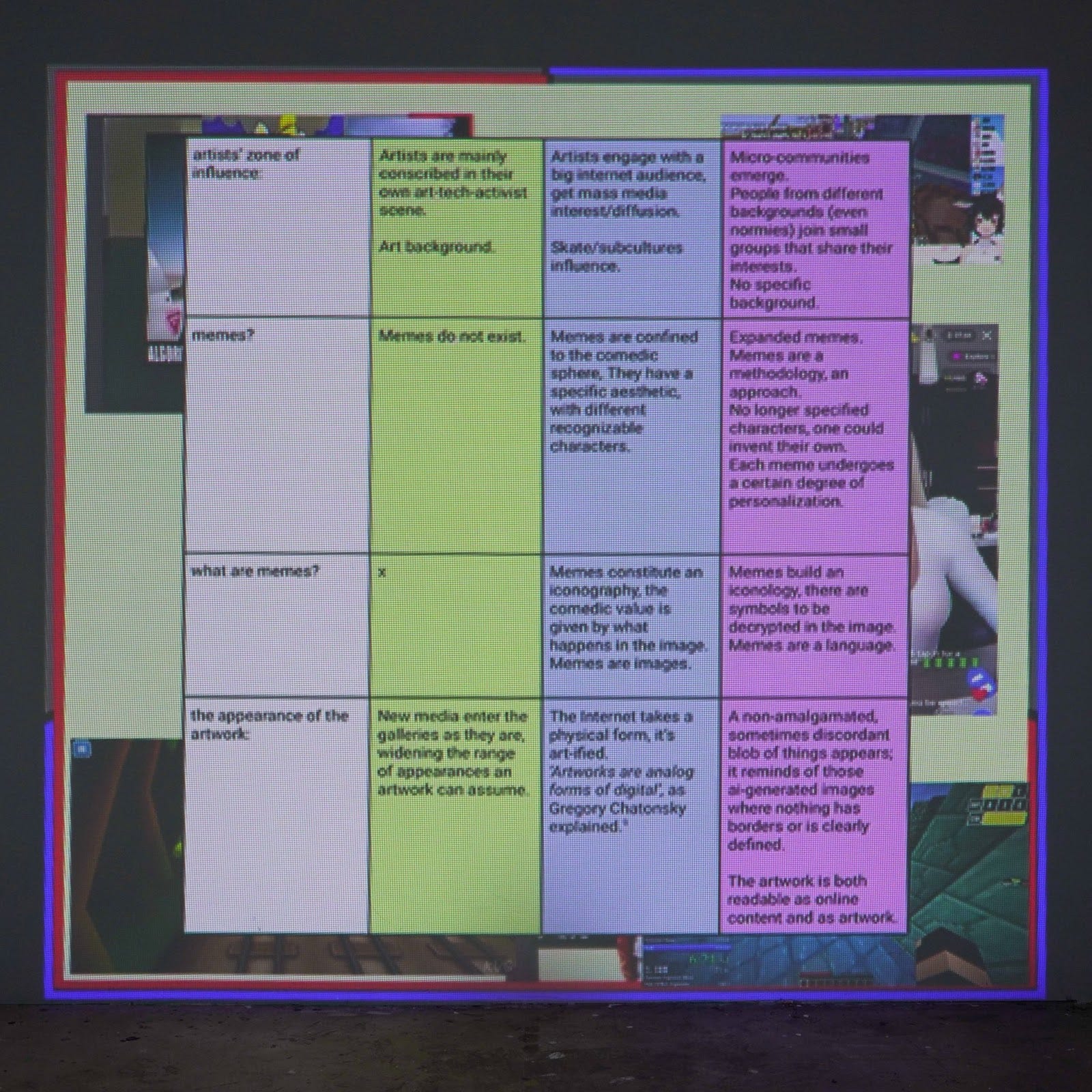 Like attention-seeking meme page admins, the artists take up discursive territory by invading your lexicon with their buzz-works (buzzword + works). As savvy gurus and prophets of irony, cores, and lores, they draw inspiration from their mediated realities; they make sense of their subjectivity in the age of deepfakes, meta-irony, memes as cultural artefacts, and hyper-referentiality.