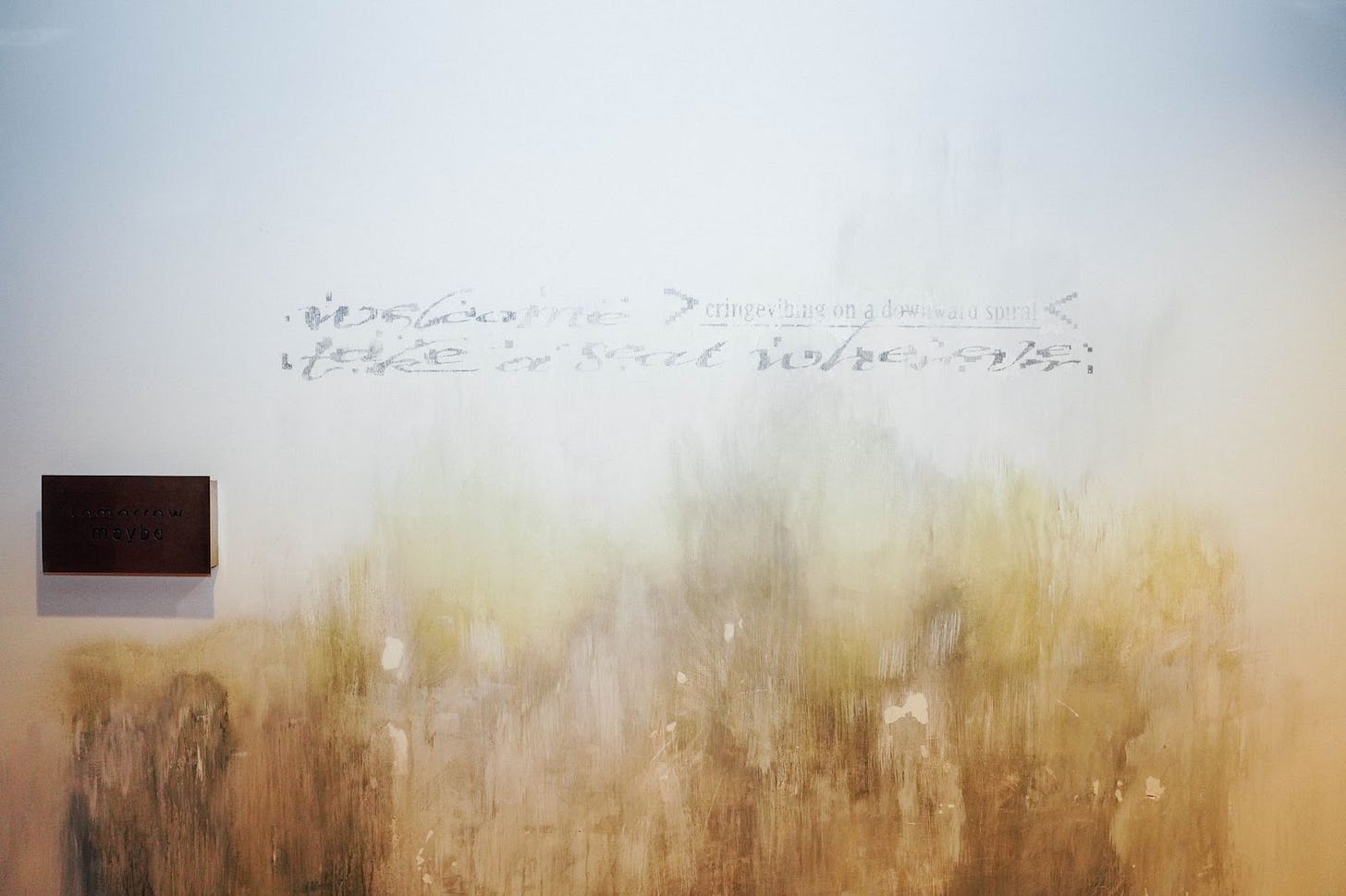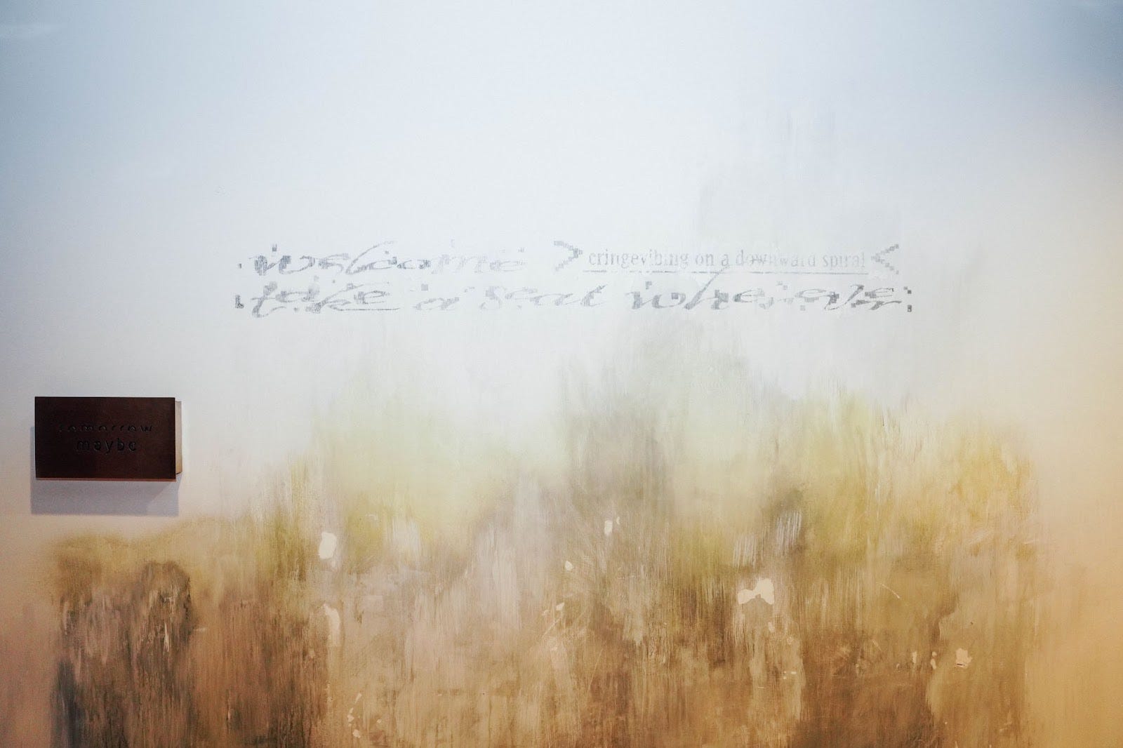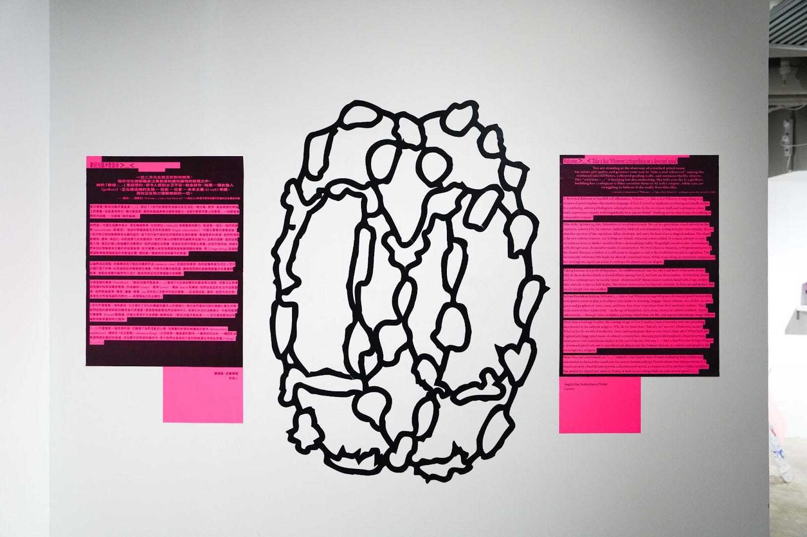A rhetorical delusion or heartfelt self-affirmation, “Welcome >_< Take a Seat Wherever (cringevibing on a downward spiral)” explores the emotive language of Gen Z as well as implications of being terminally online in a confusing, almost pathologized, schizophrenic state. In the era of post-truth and continuous crises, ironic expression is nearly indistinguishable from sincere belief. Nothing means what it says. Everything is interpretive evasion.