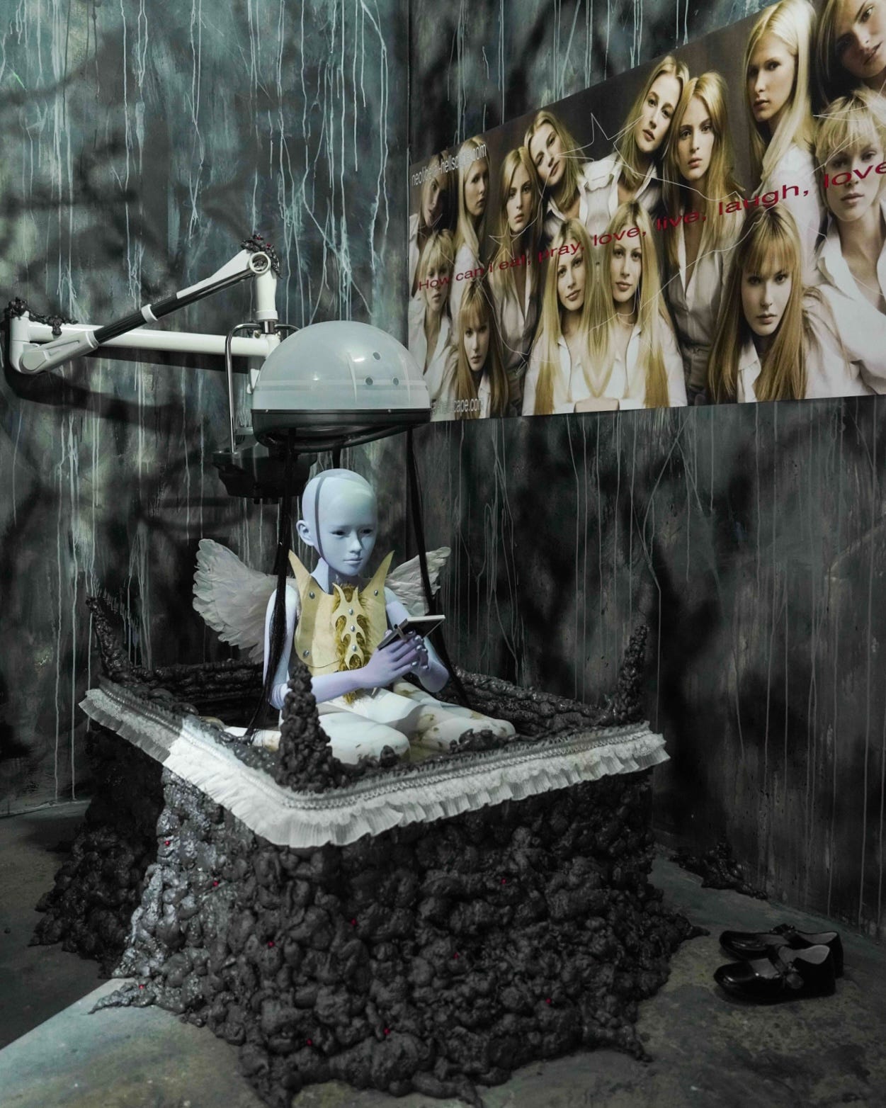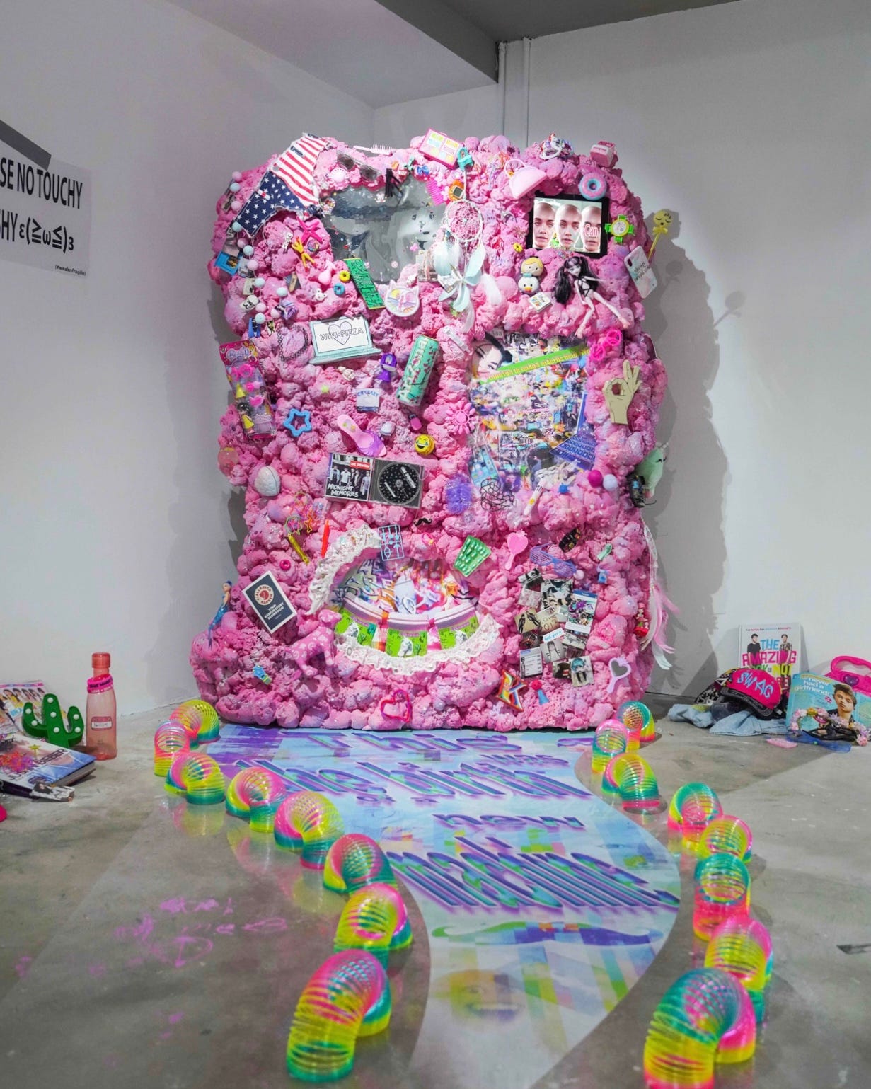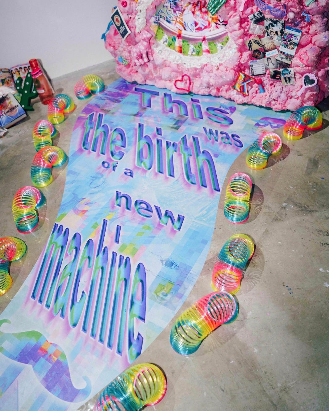 Vibe shifts. Splintering data. Relentless cycles of microtrends. We are in a generation raised entirely on the exponent: schooled by the internet, fuelled by Adderall and stimulants, gathered through server platforms, texting in hyper-referentiality. Yet, we shoulder spectres of late-capitalism, fallen idealisms, and carry the load of an ecological malaise. When the cloud has become the new infinite resource, when data capitalism encroaches upon emotionality; our feelings mined, extracted, commodified. In a manic attempt to cope, we embrace irony to shelter ourselves from a demoralising reality. We gaslight ourselves into contentment with disingenuous, dissociative modes of consumption. We try to disavow meaning, or feign meaning out of the absurd. Because somehow it is still easier to imagine an end to the world than an end to capitalism. The memetically referential title lends the show its contextual chaos. While cringevibing, an oxymoron composite of two neologisms, signals an action to embrace the absurd and our disgust.