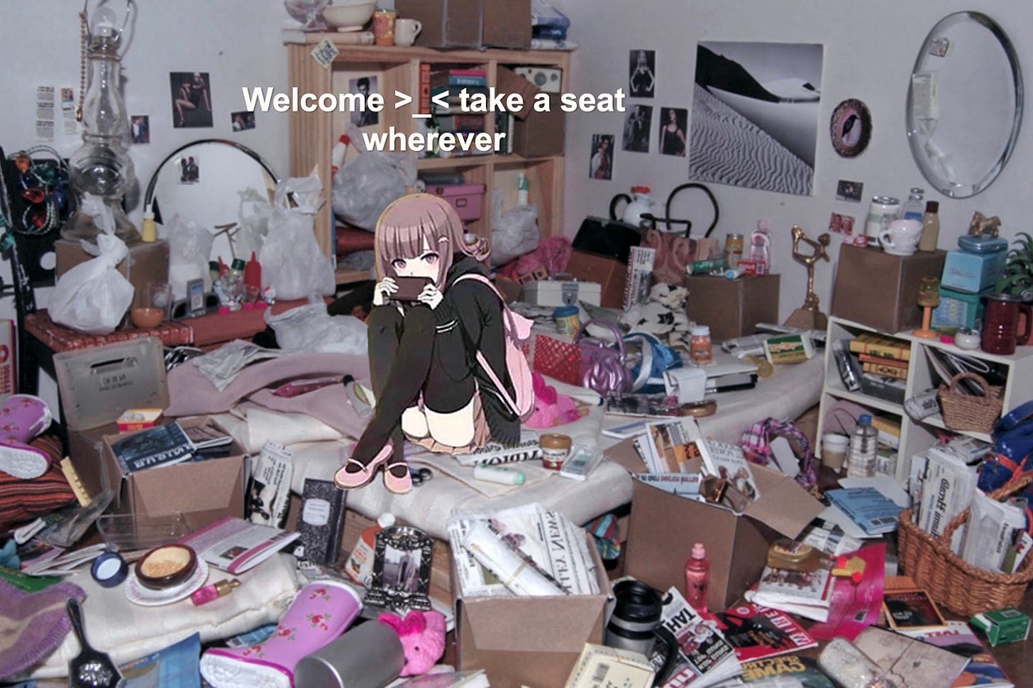 You are standing at the doorway of a trashed-piled room. An anime girl smiles and gestures your way to “take a seat wherever” among the scattered takeout boxes, yellowed peeling walls, and ominous thrifty objects. Her “welcome >_<” is inviting but discomforting. She tells you she is a girlboss building her ecological techno-socialist-futurist AI web3 empire, while you are struggling to fathom if she really lives like this.
