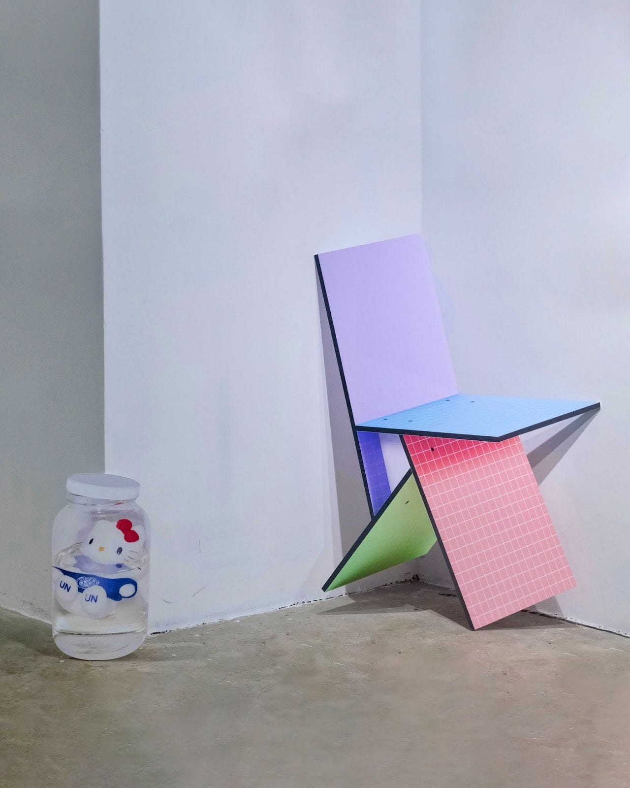 The early 2010s marked a significant inflection in the history of the internet, harkening back to the beginning of trend cycles perpetuated through the internet. Titling her mixed media sculpture “God from the machine” in Latin, multimedia artist Janice Kei laments the halcyon days of the Tumblr era, where indie sleaze reigned and sincere dorkiness was celebrated, where “free size, fit for all” clothes were the undisputed truth. A tactile capsule of #corecore relics: galaxy print leggings, plastic wristbands, moustache necklaces, kitschy collages, and a video memoir surrenders us to the birth of a new machine. Reflecting on the cultural schizophrenia of the last decade, art, design, and publishing duo Brandon Bandy and Rachel Jackson borrow from postmodern design to vessel contemporary themes of trend analysis, hyper-stitions (self-fulfilling prophecy), as well as to de-virtualize image-objects of clout or internet vocabulary (re-introducing, the Political Compass..!). 2D bootlegs of Ettore Sottsass’ design objects, Superstudio’s Quaderna series, the infamous Pony Cum Jar, see the artists mediating art through photography such as in 60-70’s conceptual works, the pictures generation, and the post-internet movement.